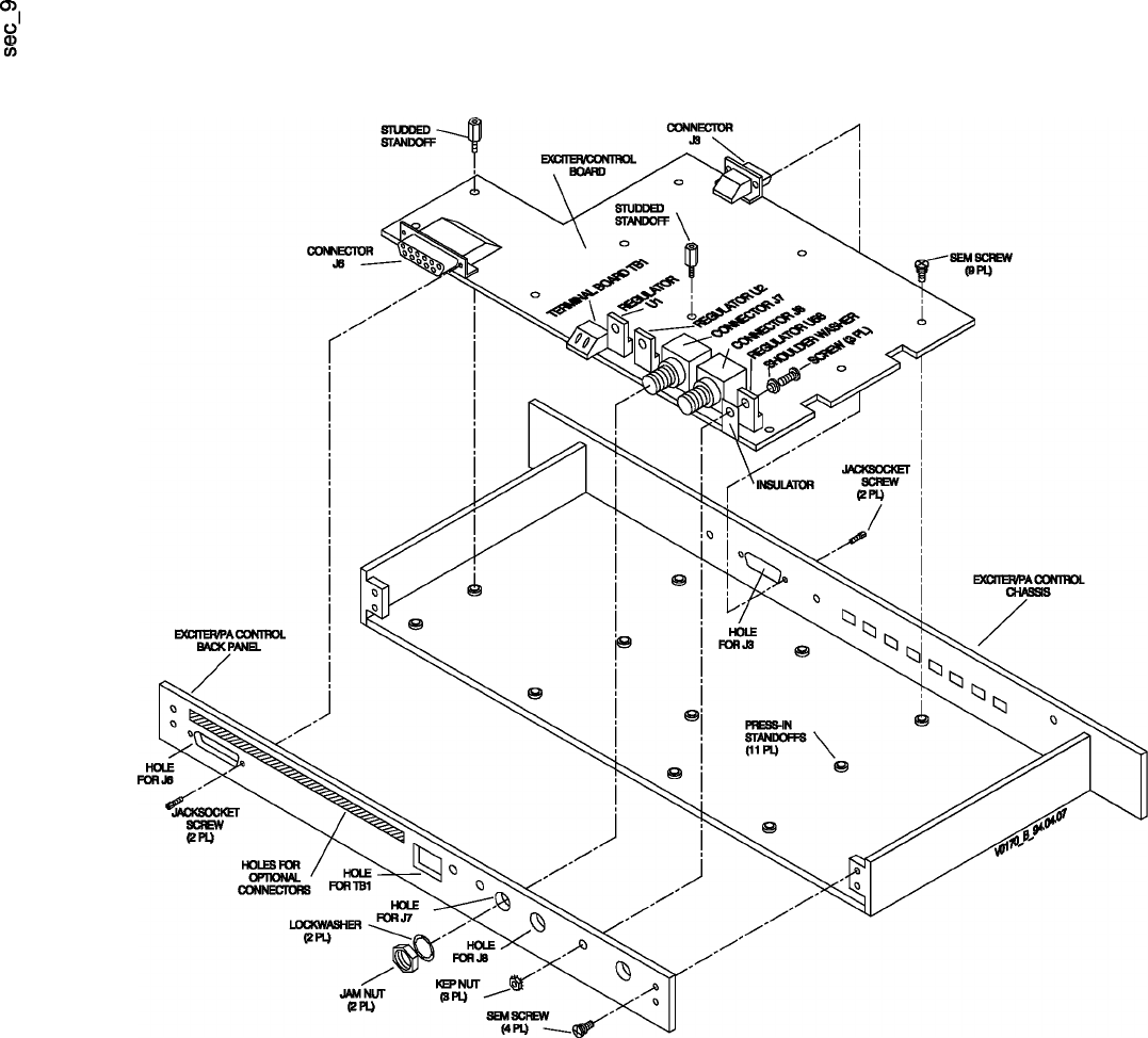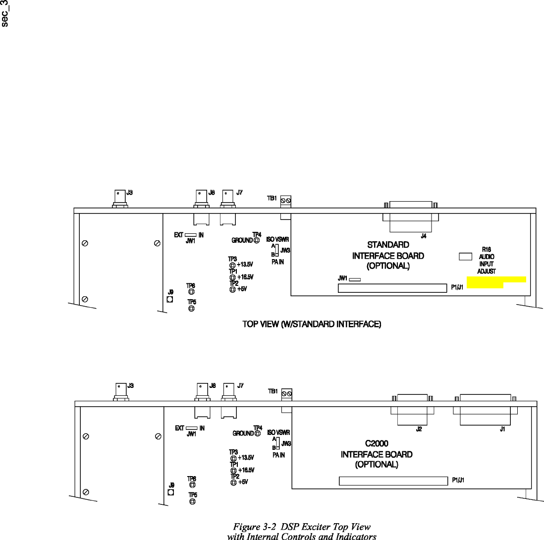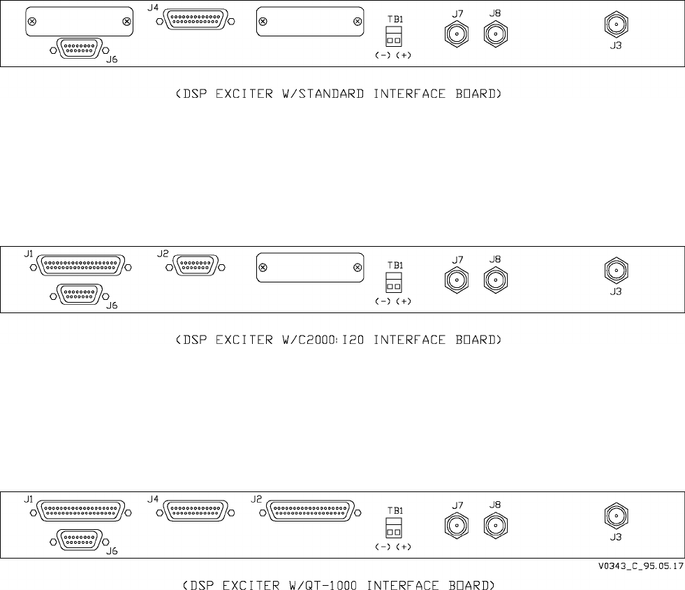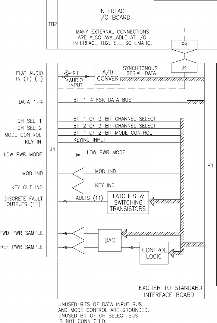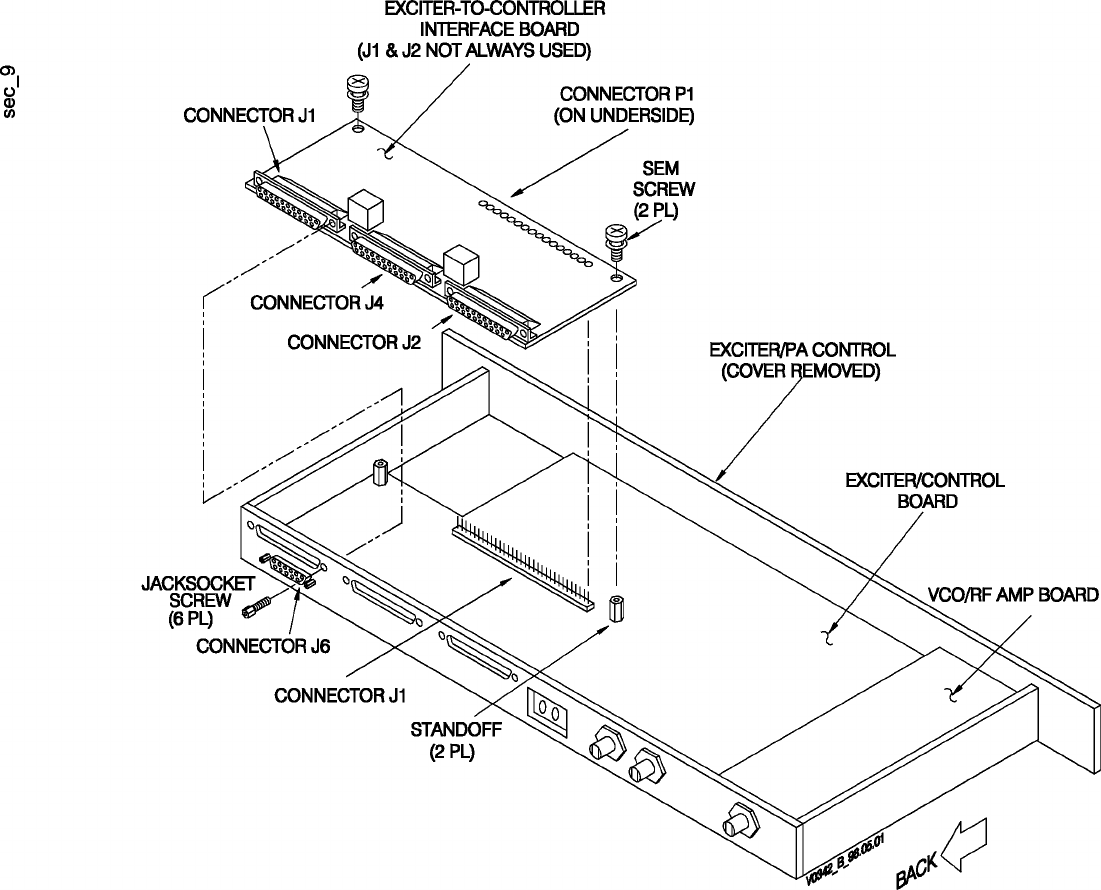 exciter interfaces with the transmitter through connector J2 and the controller through J1.