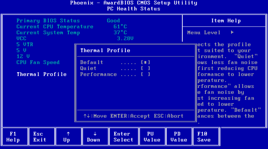 Selects the thermal management profile best suited to your environment. "Quiet" allows less fan noise by first