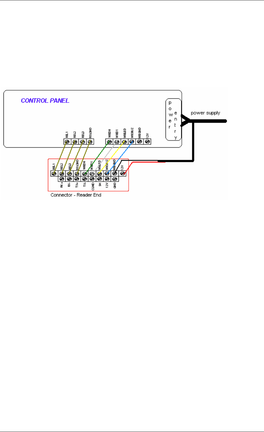 Connect the D0, D1, LED, BUZZER, RELAY lines from the reader to the control panel.