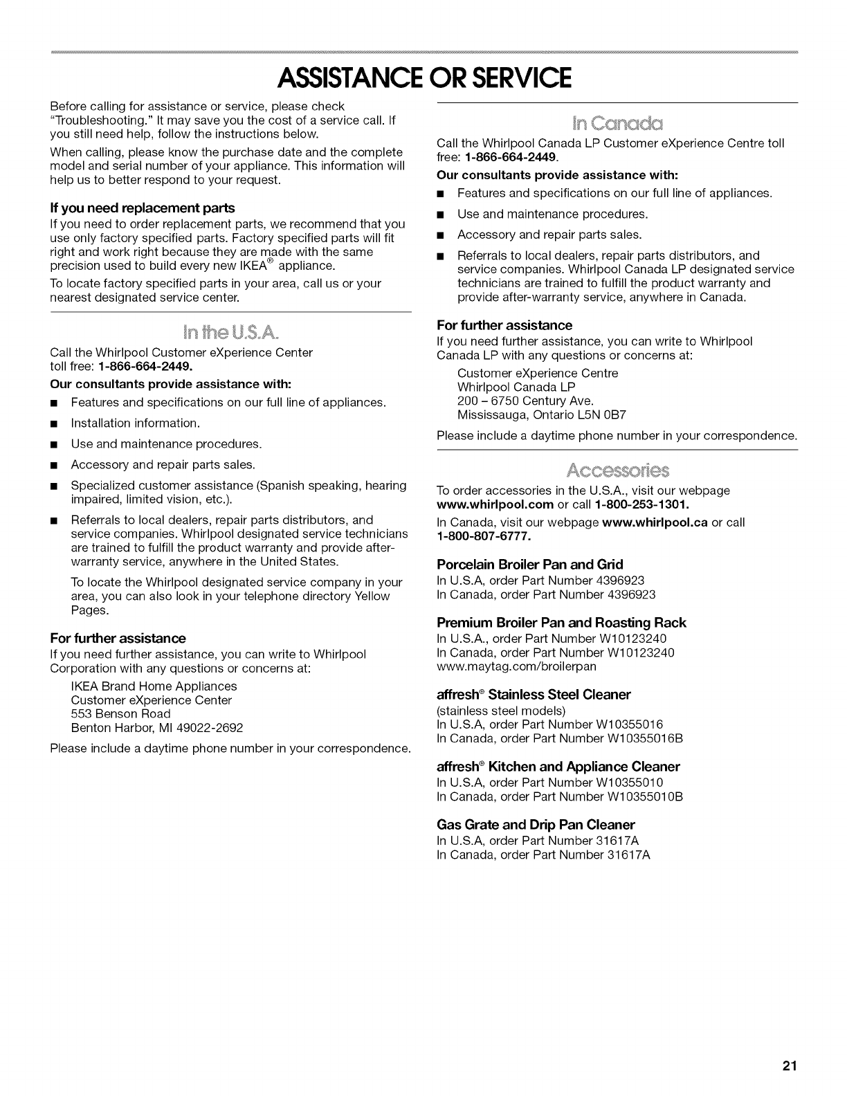 parts, accessories or service, call: 1-866-664-2449.