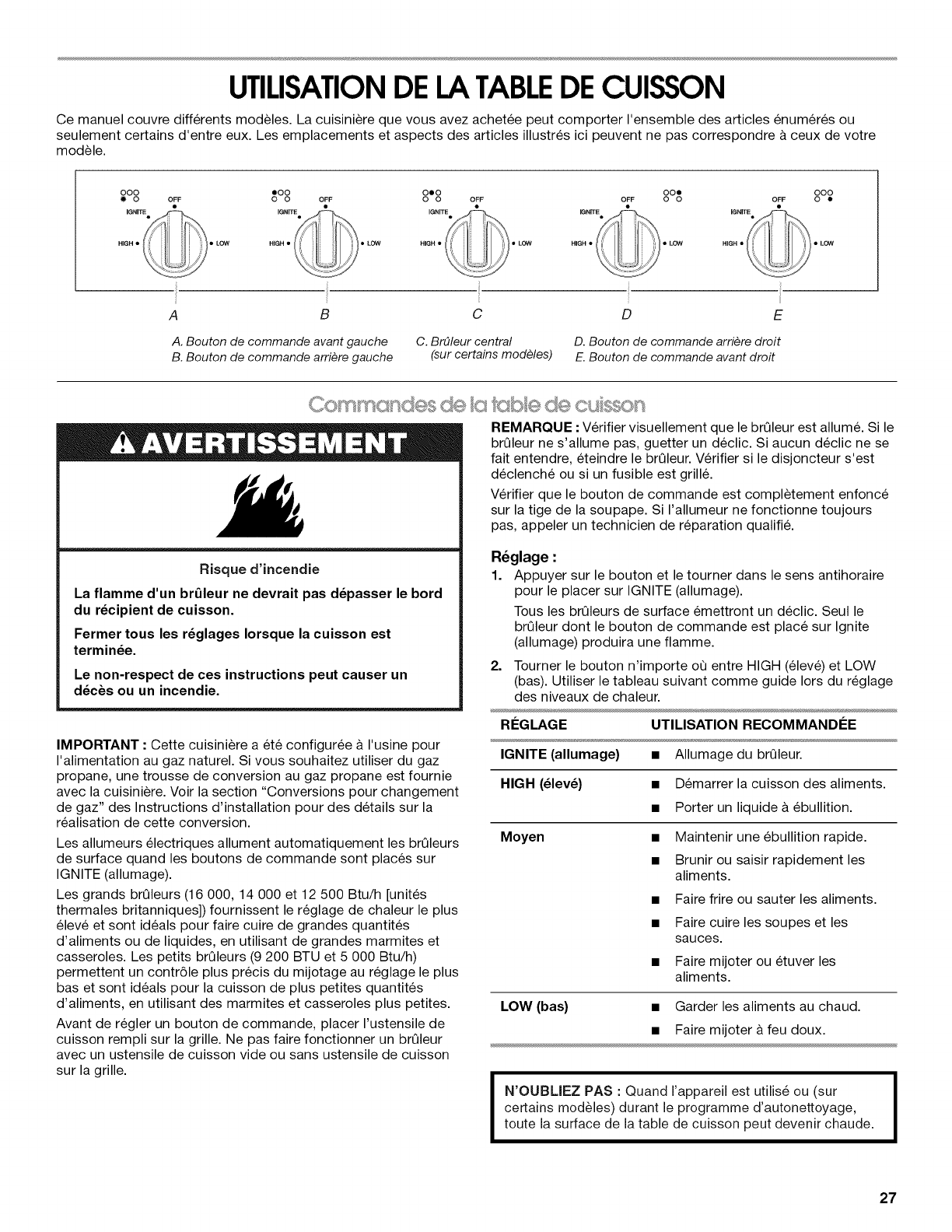 Commandes de la table de cuisson .......................................... 27