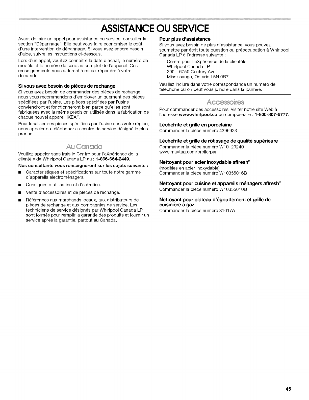 I'adresse www.whirlpool.ca ou composez le : 1-800-807-6777.