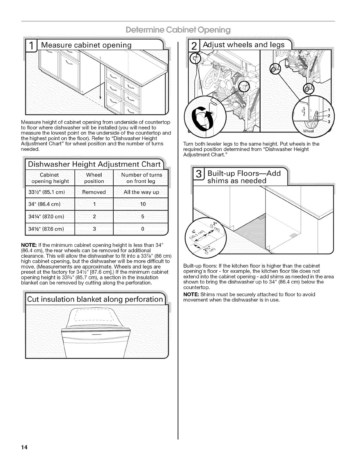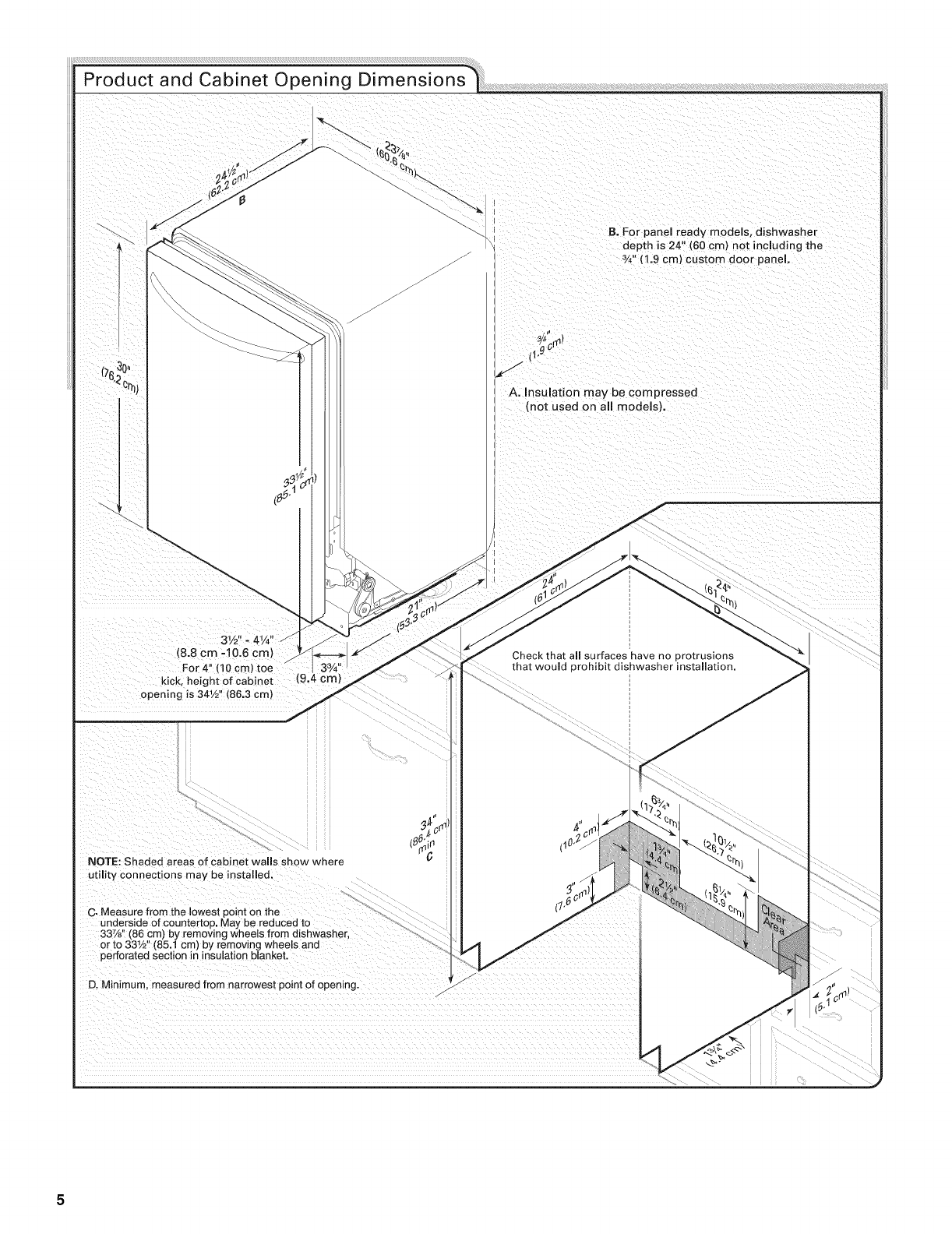 Open door and check that space between dishwasher cabinet