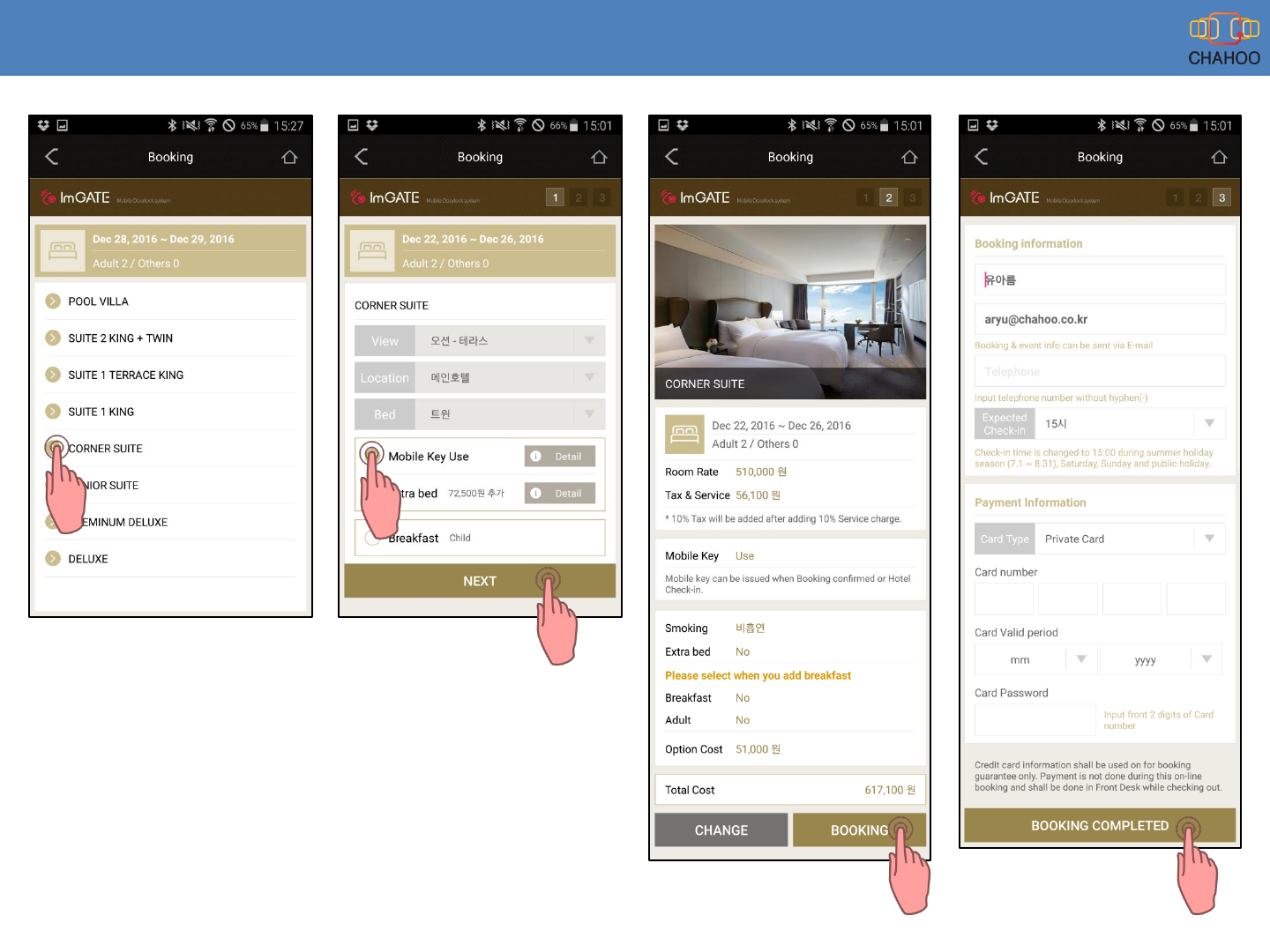 8. Put Booking and Payment information and touch “BOOKING