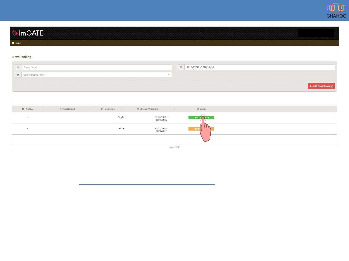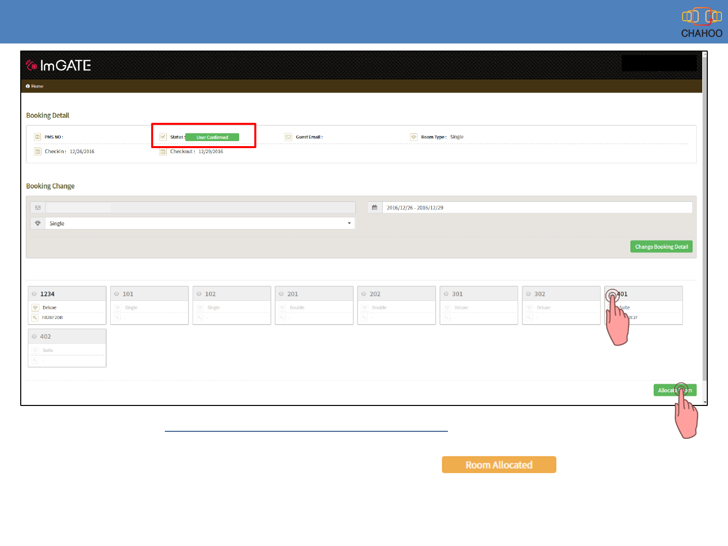 1. If Guest already made a booking, just click “User Confirmed” of green button to allocate the room.