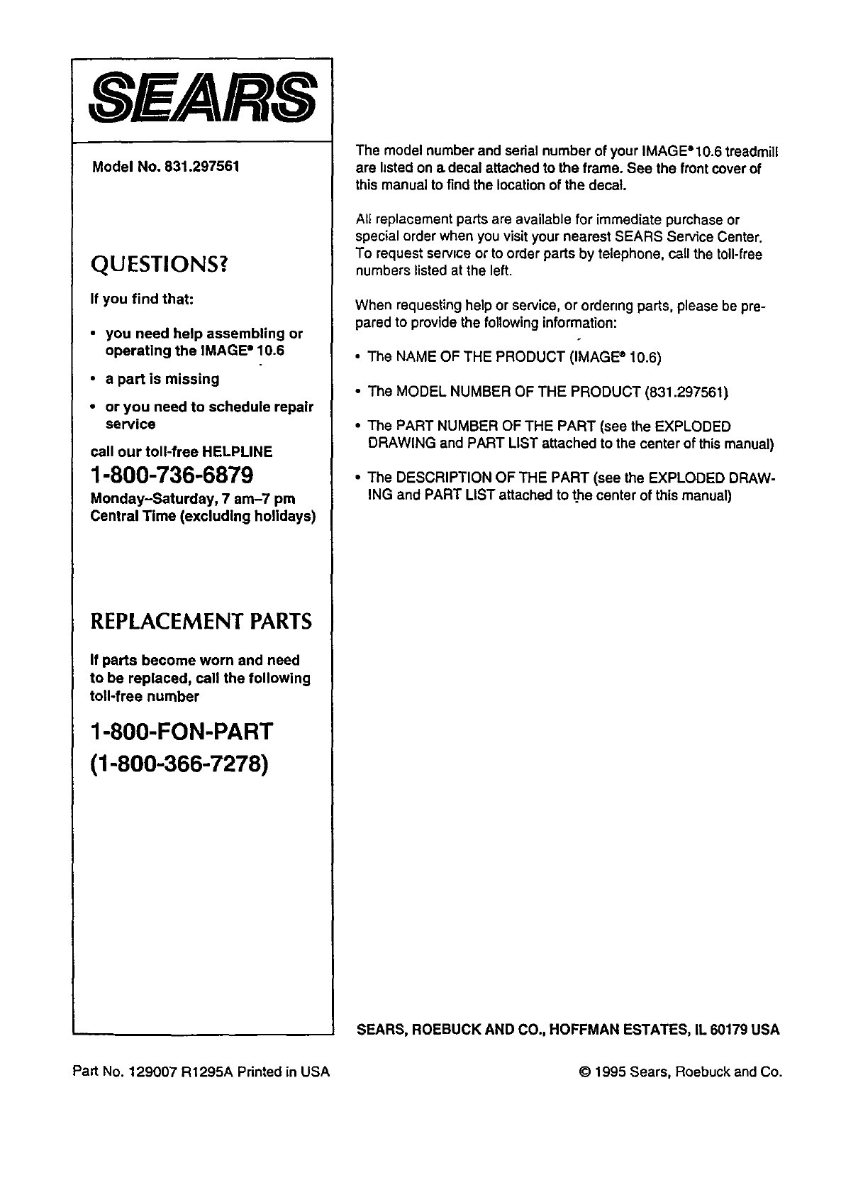 this SEARS TREADMILL EXERCISER, cor_tactthe nearest SEARS Service Center throughout the