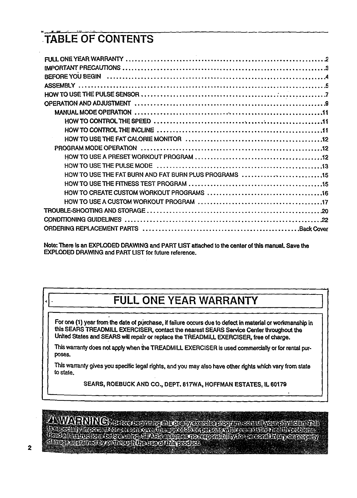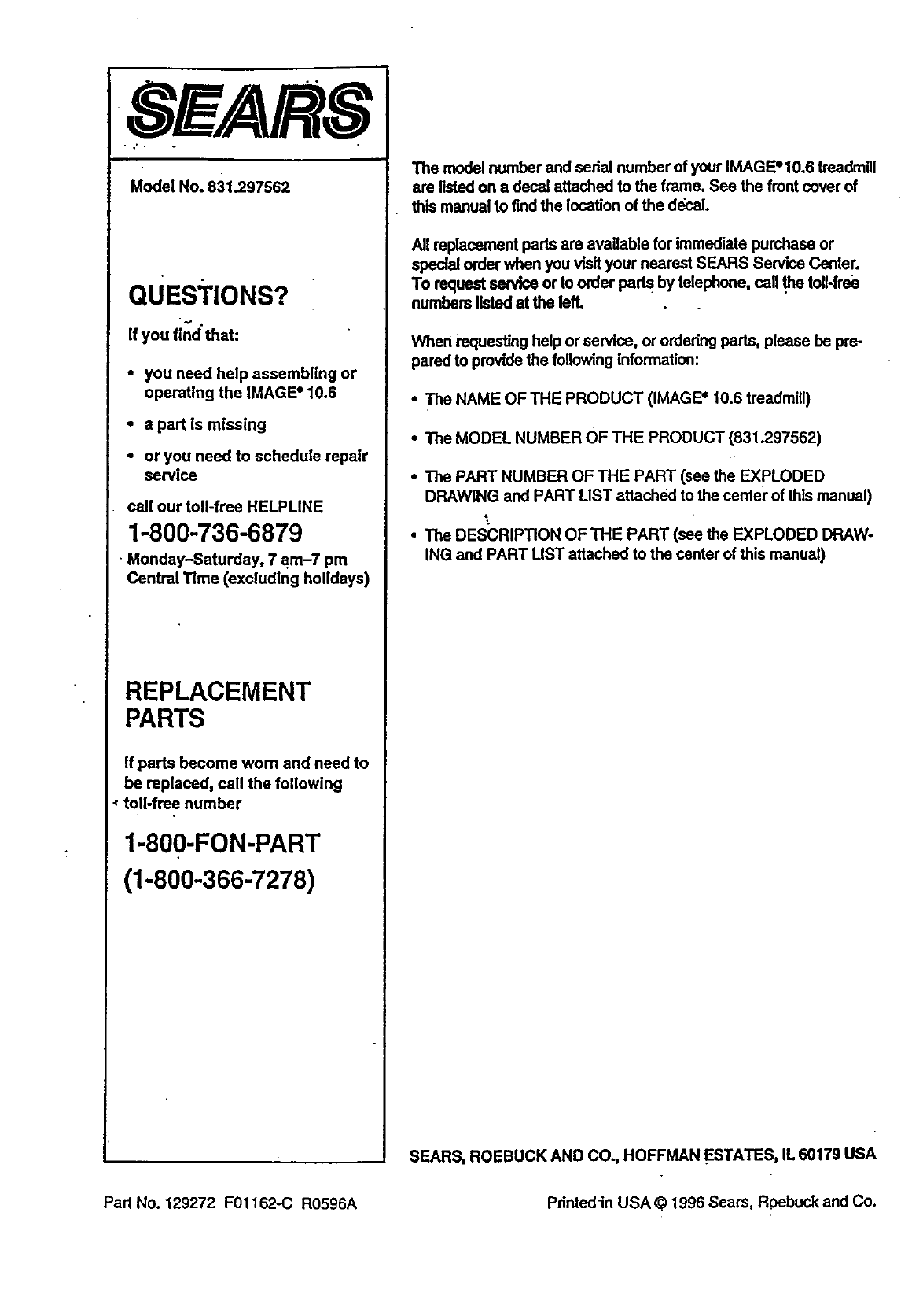 this SEARS TREADMILL EXERCISER, contact the nearest SEARS See/ice Center throughoutthe
