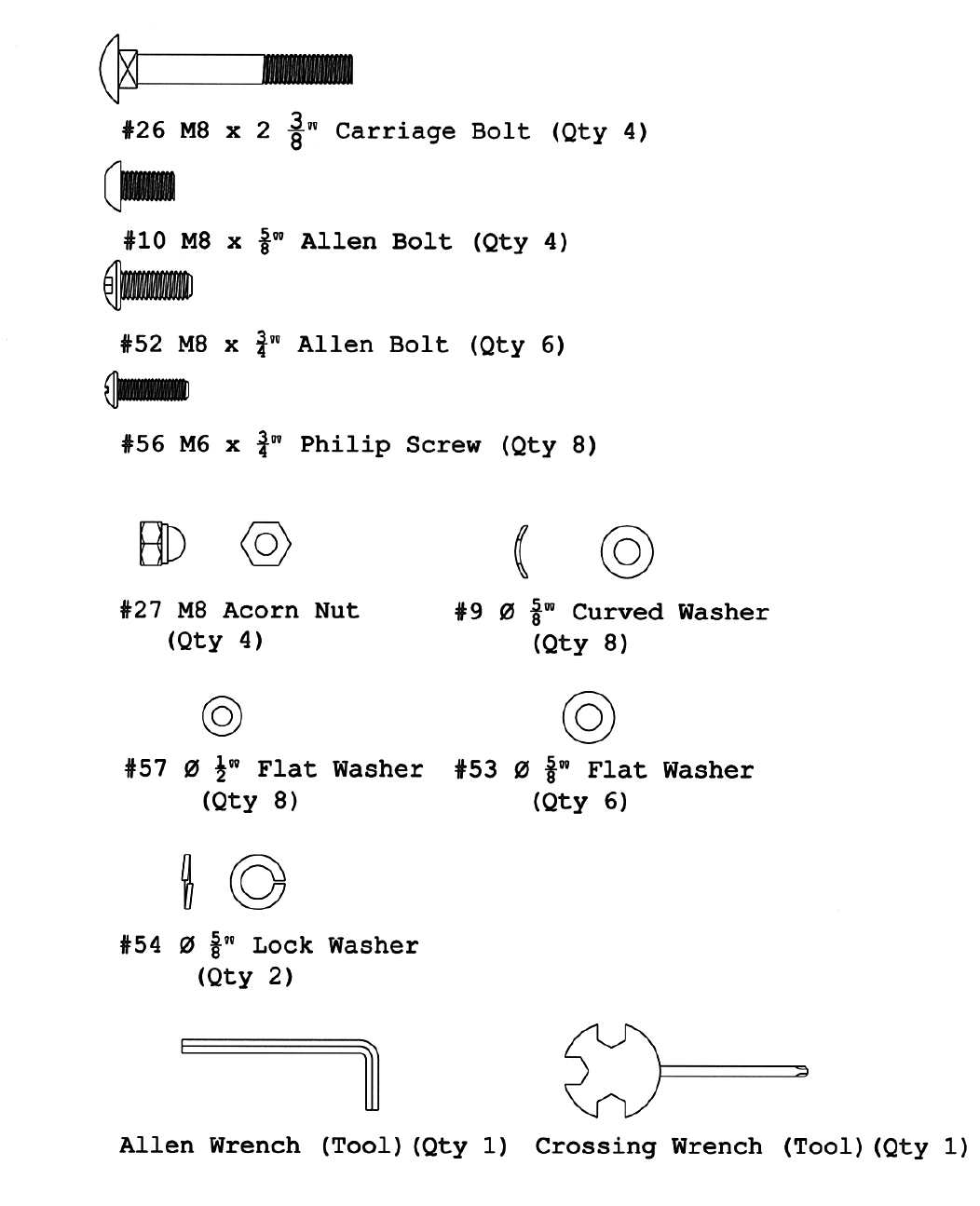 - Secure them together with two M8 x 2 3/8” Carriage Bolts (#26), two Ø 5/8” Curved Washers (#9), and two M8 Acorn Nuts (#27).