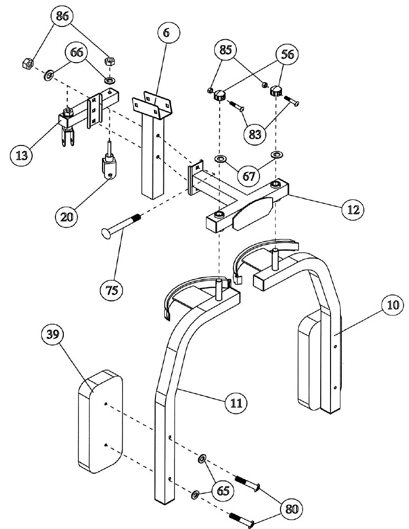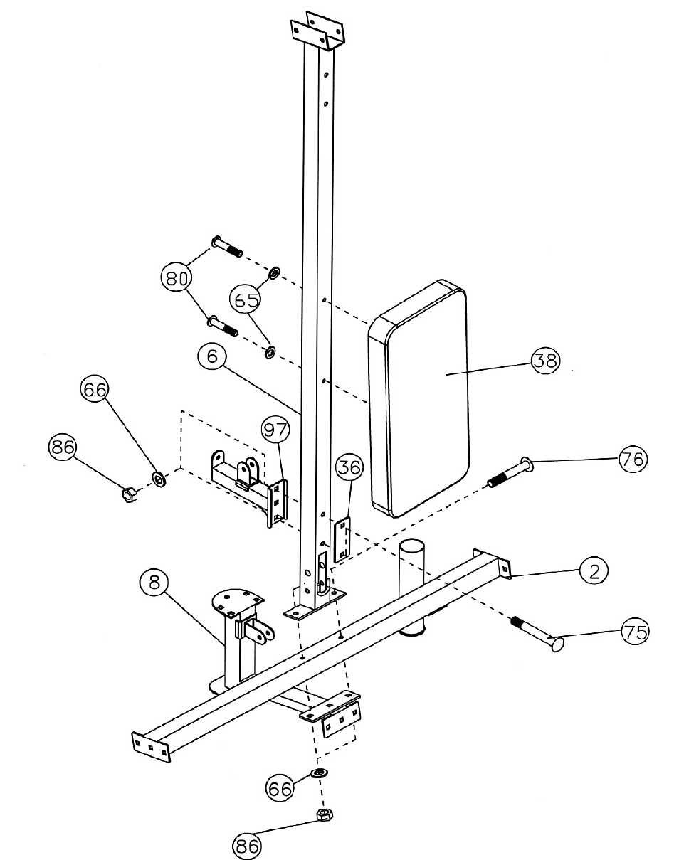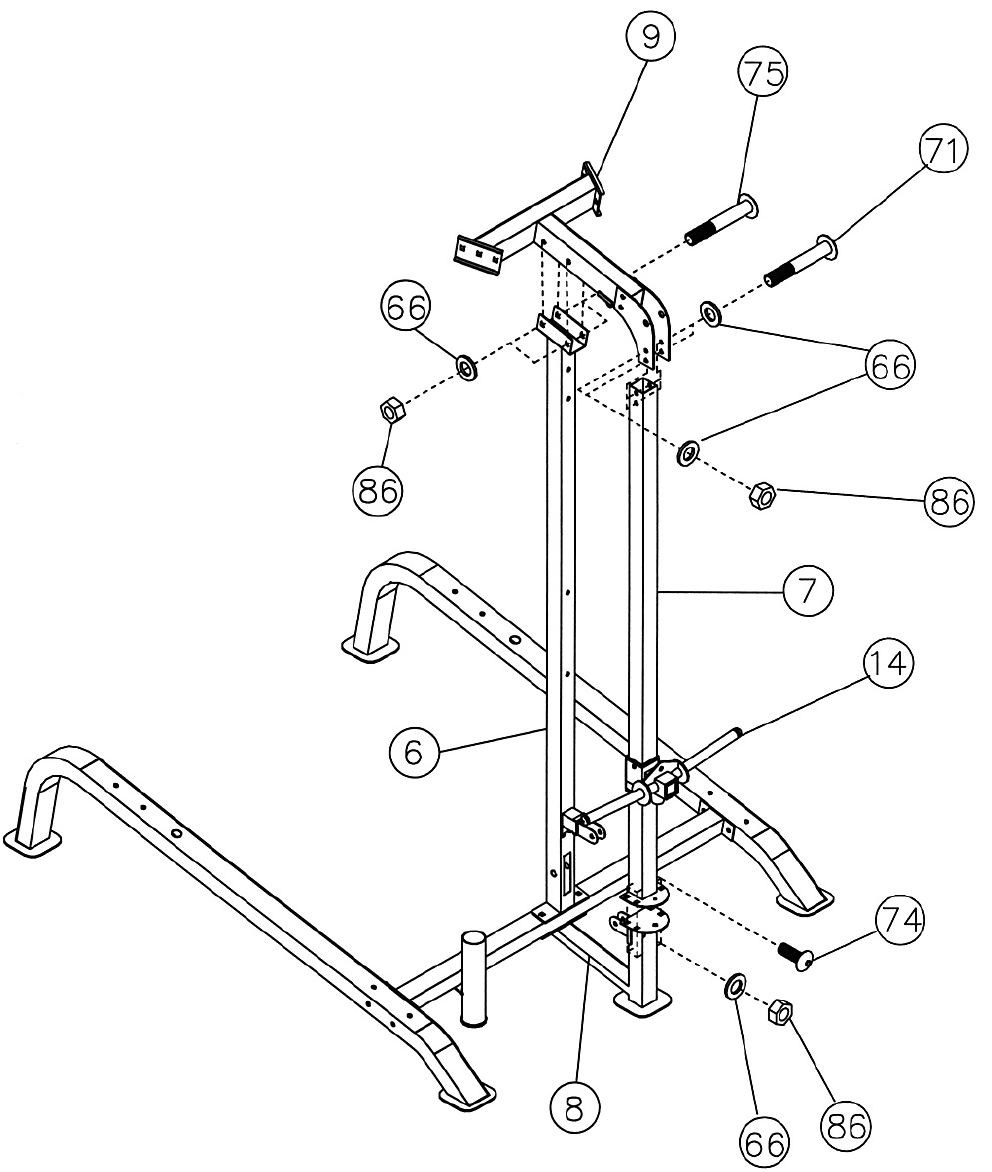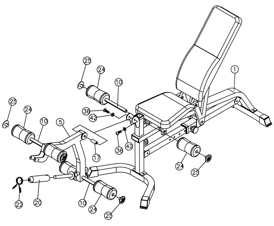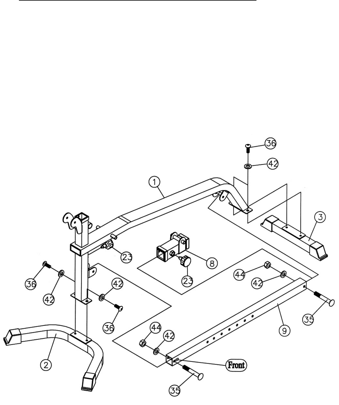 Bolts (#41) and two 5/8” Washers (#43). Insert the Arm Curl Stand into the front opening