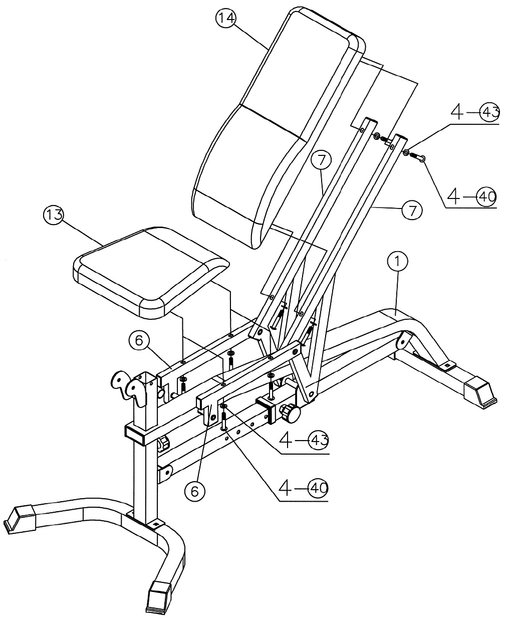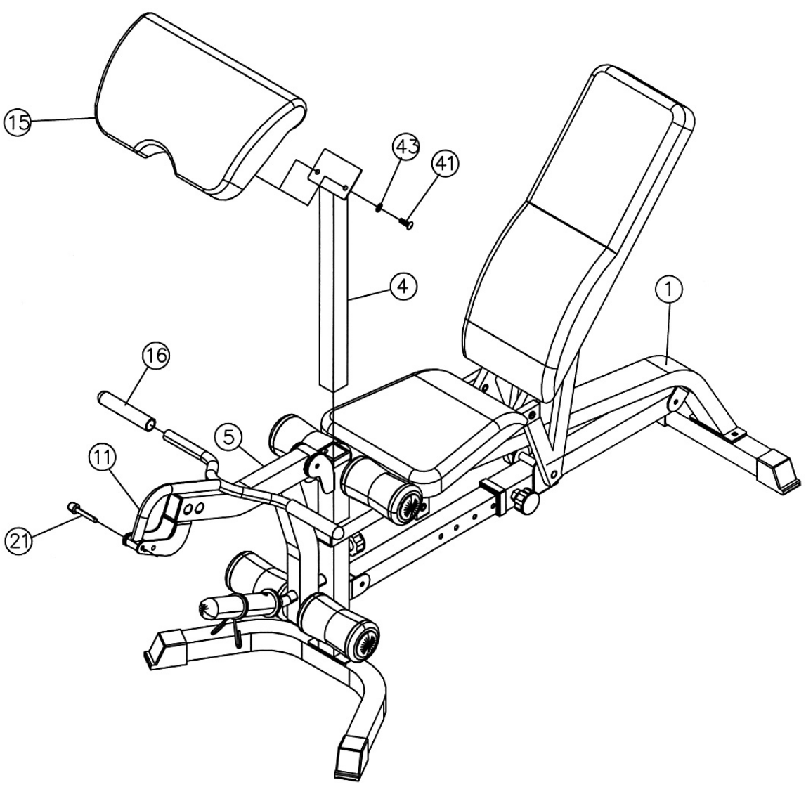 B.) Attach the Arm Curl Handle (#11) to the open bracket on the Leg Developer (#5). Lock it with