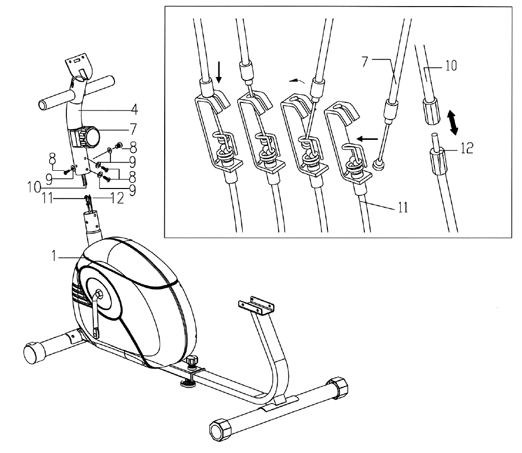 - Connect Upper Computer Wire (#10) to the wire on the Computer. Remove the two M5 x 3/8” Philips Screws (#3) from Computer. Slide the Computer onto the bracket on Front Post. Secure it with the two Screws.