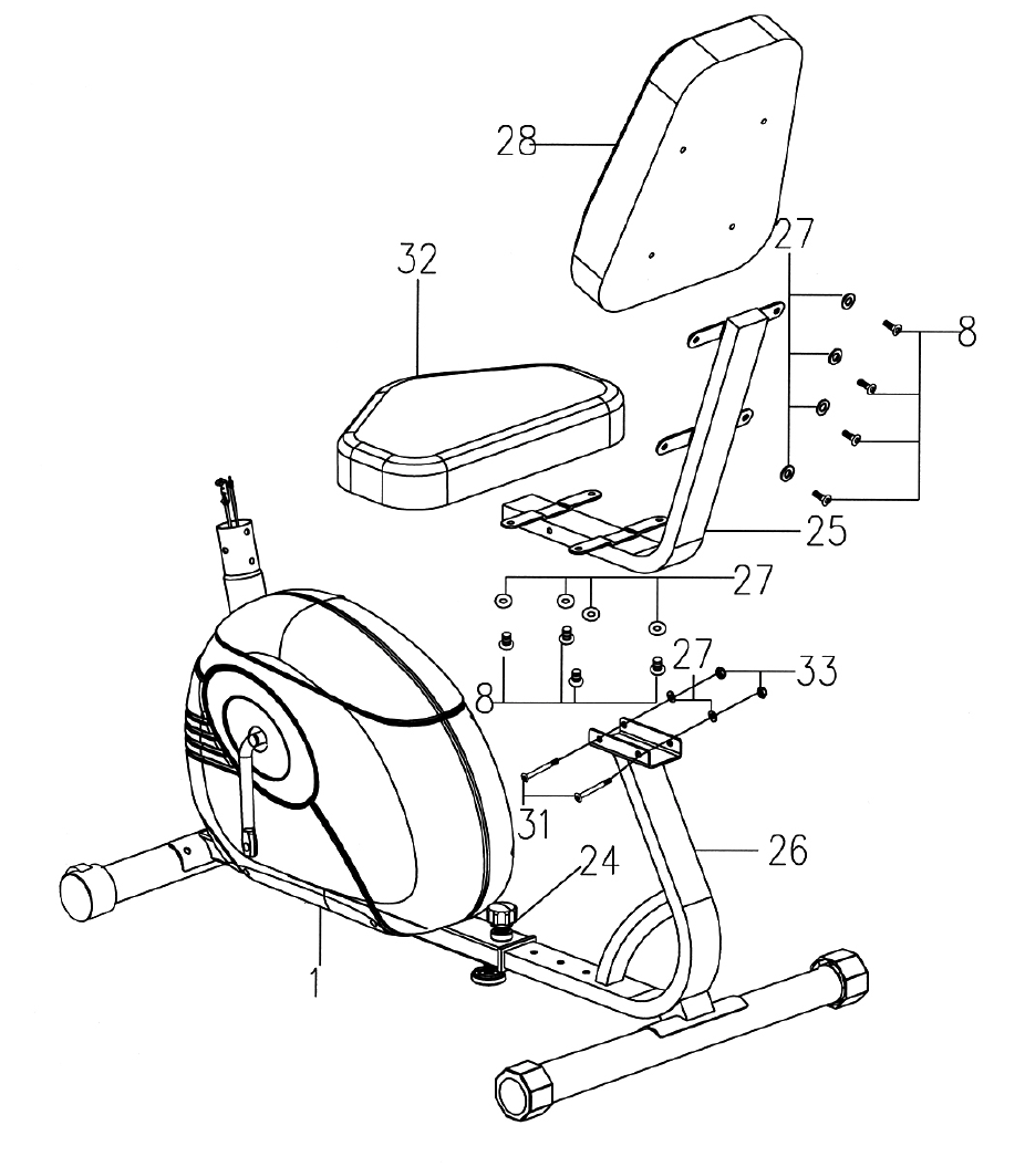 - Attach the Seat Pad (#32) to the Seat Support. Secure it with four M8 x 5/8” Allen Bolts (#8) and four Ø 5/8” Washers (#27).