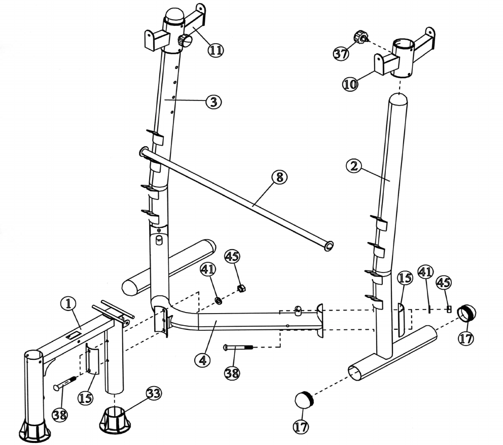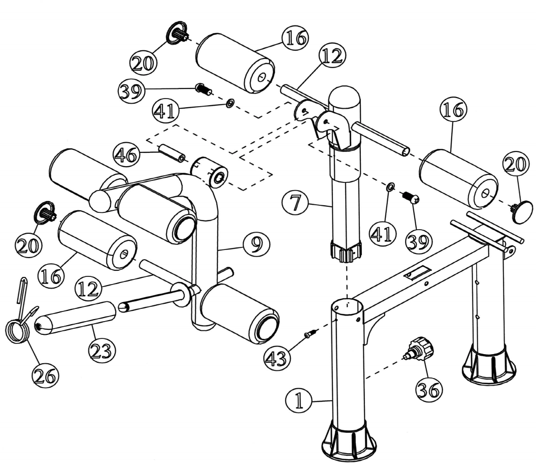 - Attach the Leg Developer (#9) to the Leg Developer Holder. Secure it with an Axle (#46), two M10 x 5/8” Allen Bolts (#39) and ( ¾” Washers (#41).