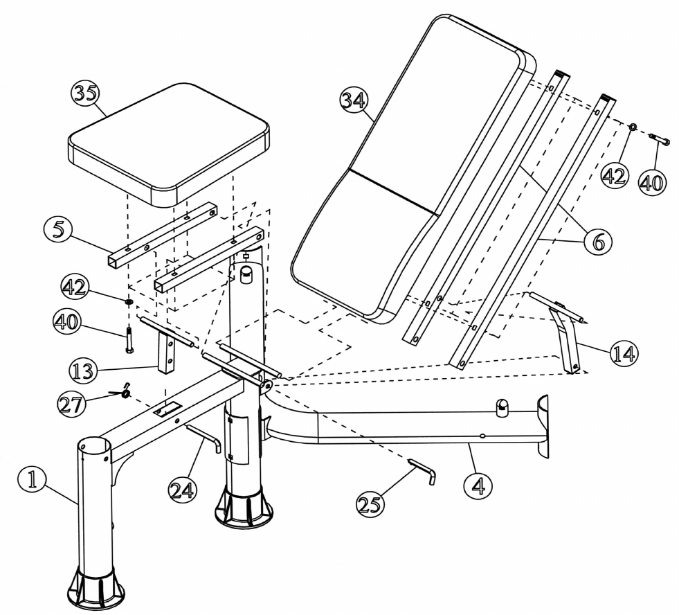 - Insert the Leg Developer Holder (#7) into the top opening on the Main Seat Support (#1). Thread a ½” Philips Screw to secure the sleeve on the Leg Developer Holder. Secure the Leg Developer with a M12 Lock Knob (#36).