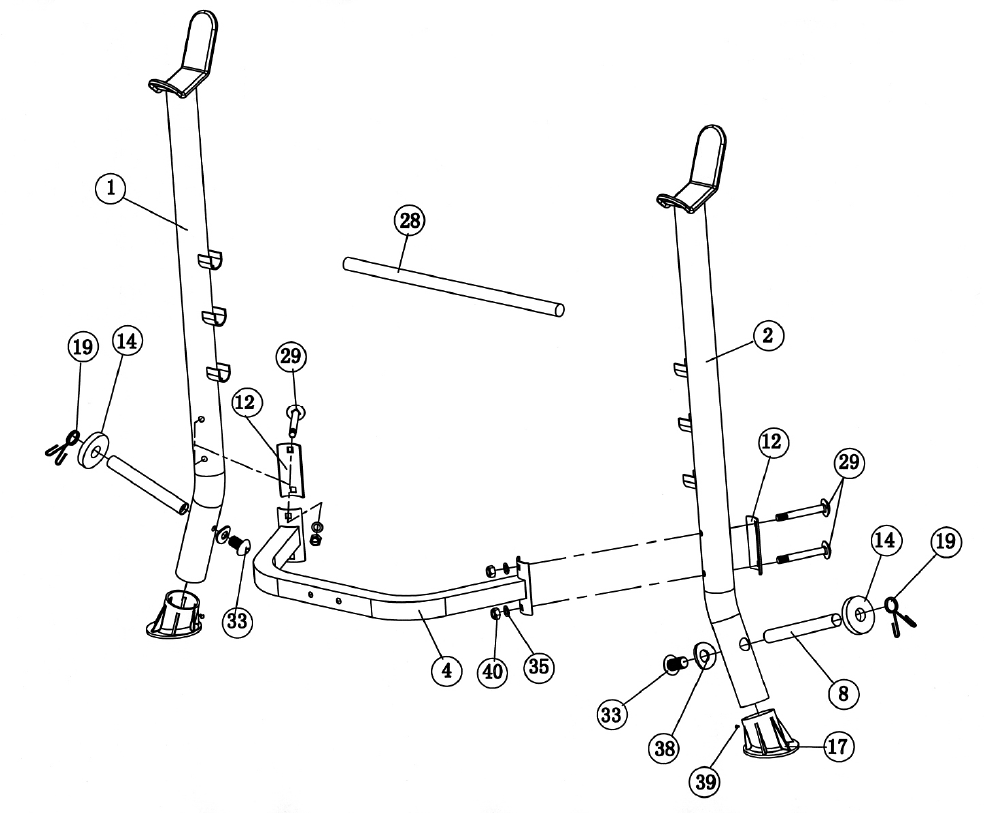 - A.) Attach the Backrest Supports (#10) onto both ends of the pivot on the Main Seat Support (#3). Place the other end rest against the Backrest Adjustment Bar (#28).
