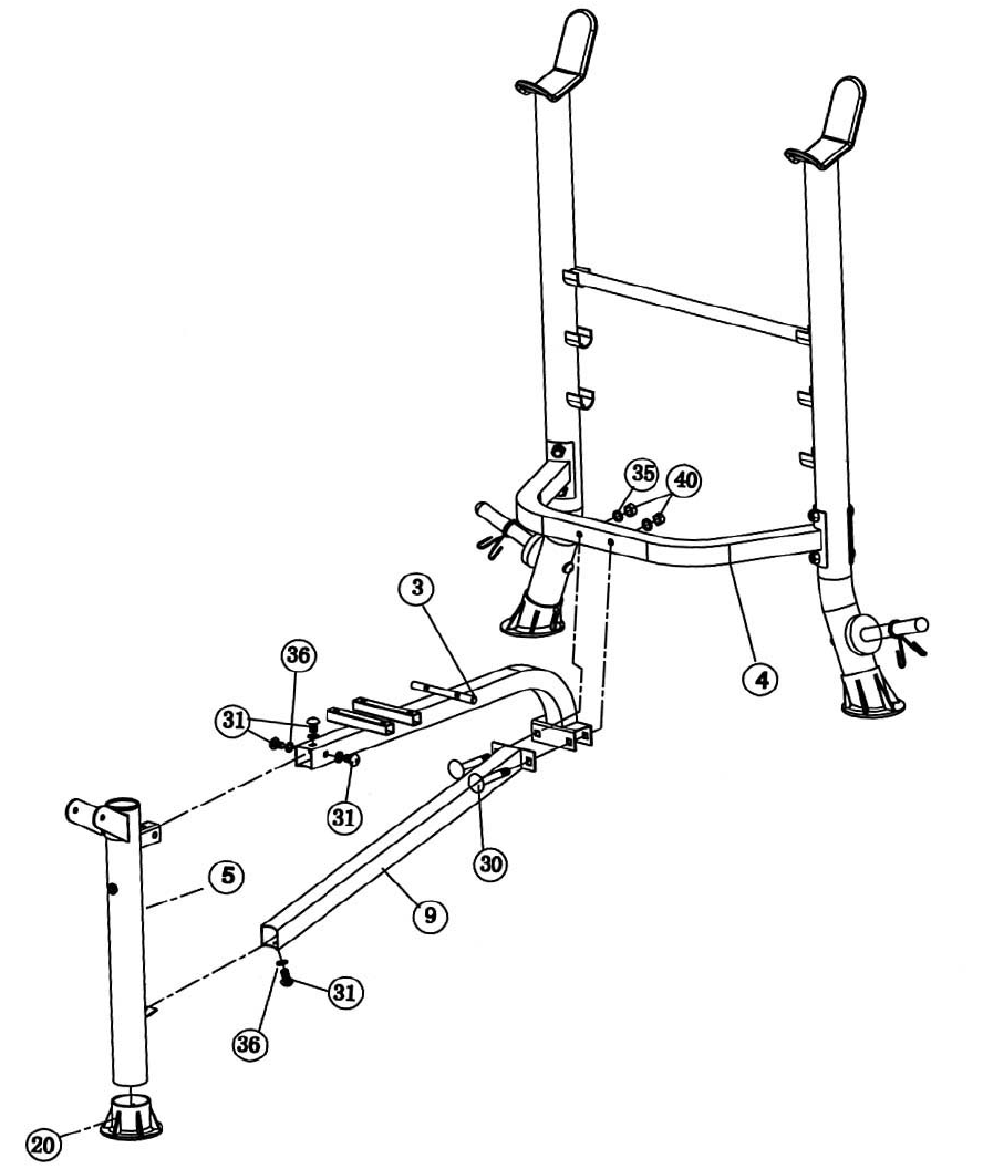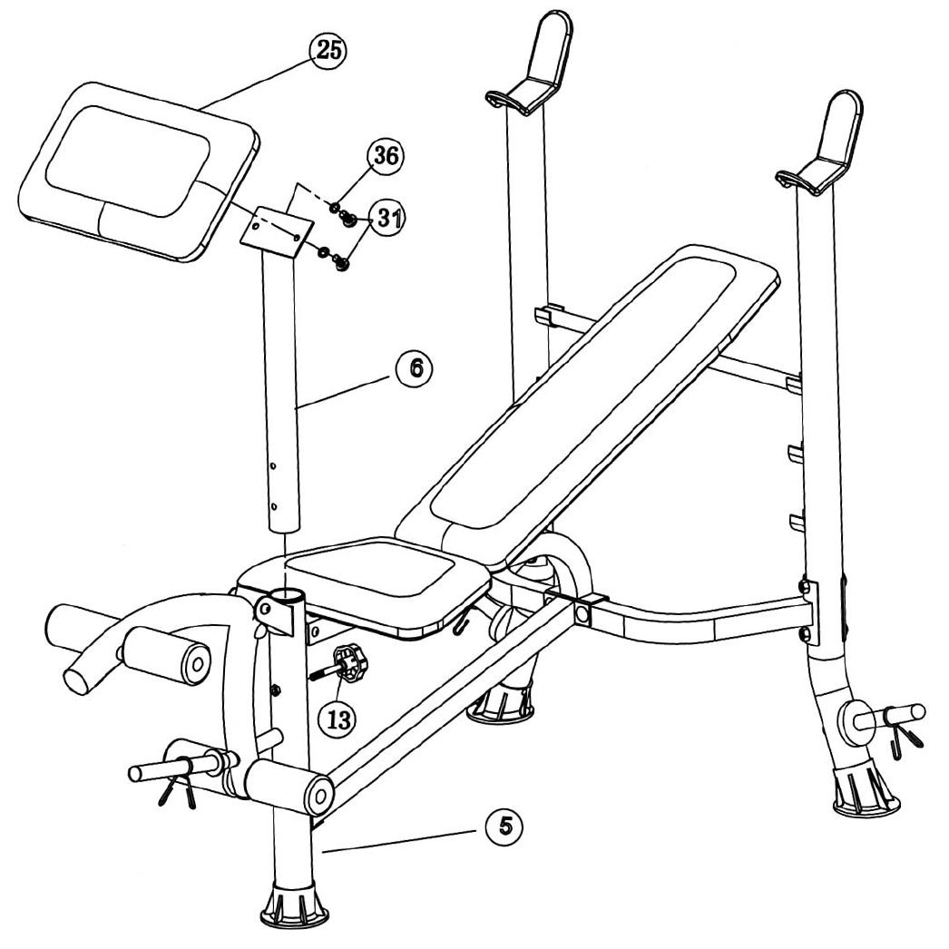 - A.) Attach the Arm Curl Pad (#25) to the Arm Curl Stand (#6). Secure it with two M8 x 5/8” Allen Bolts (#31) and Ø 5/8” Washers (#36).