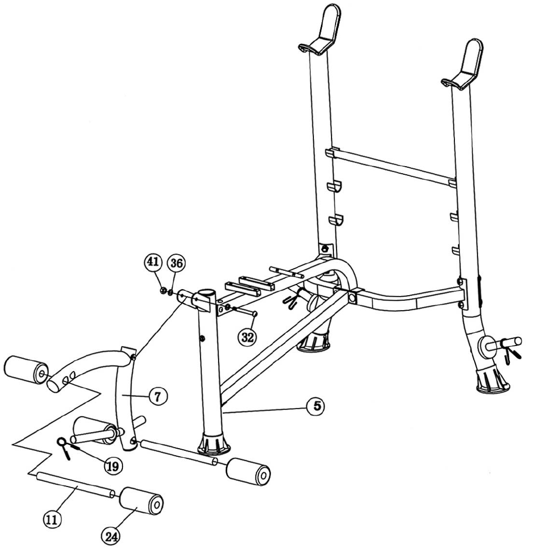 - A.) Attach the Leg Developer (#7) to the Front Leg (#5). Secure it with one M8 x 3 1/8” Allen Bolt (#32), two Ø 5/8” Washers (#36), and one M8 Aircraft Nut (#41).