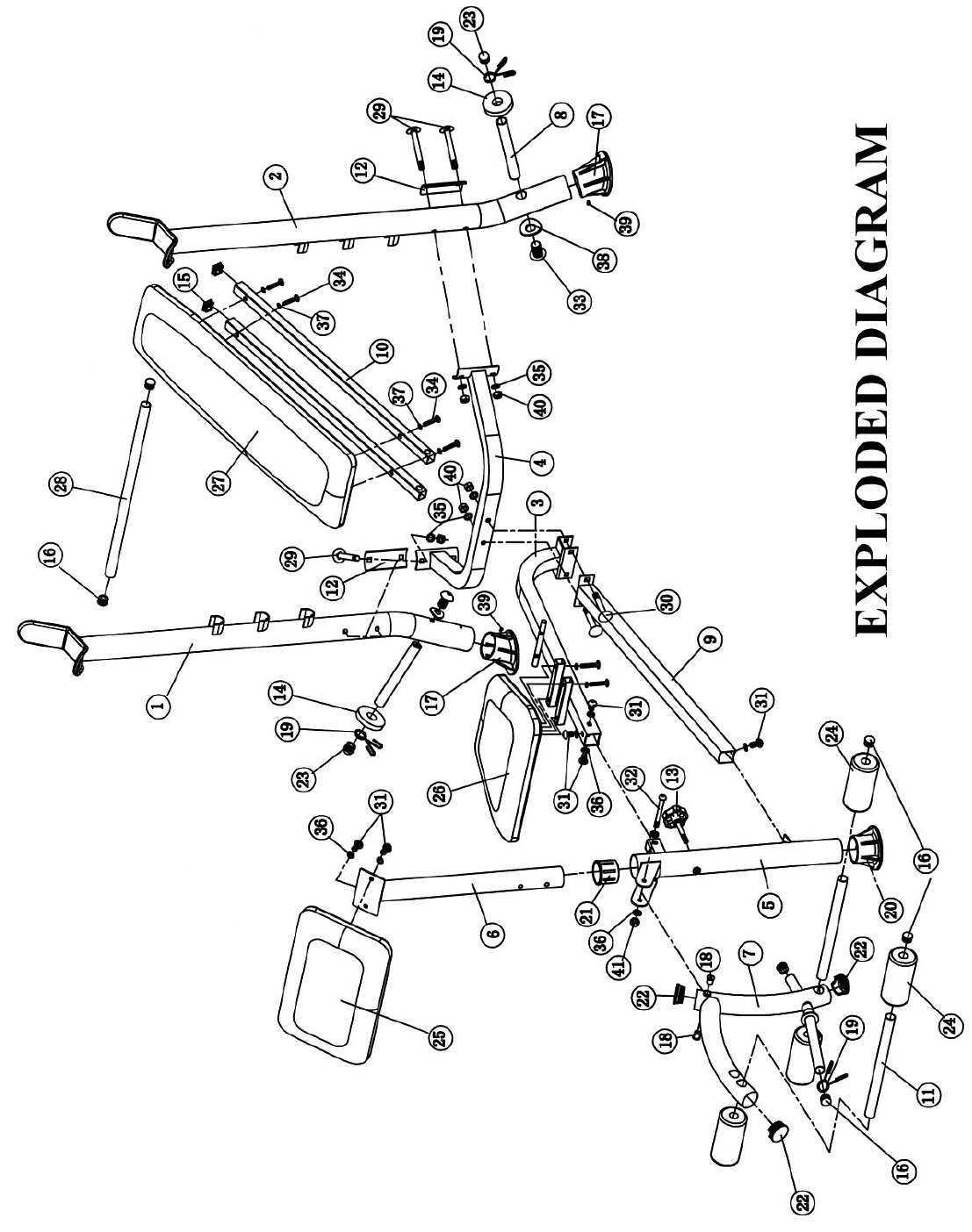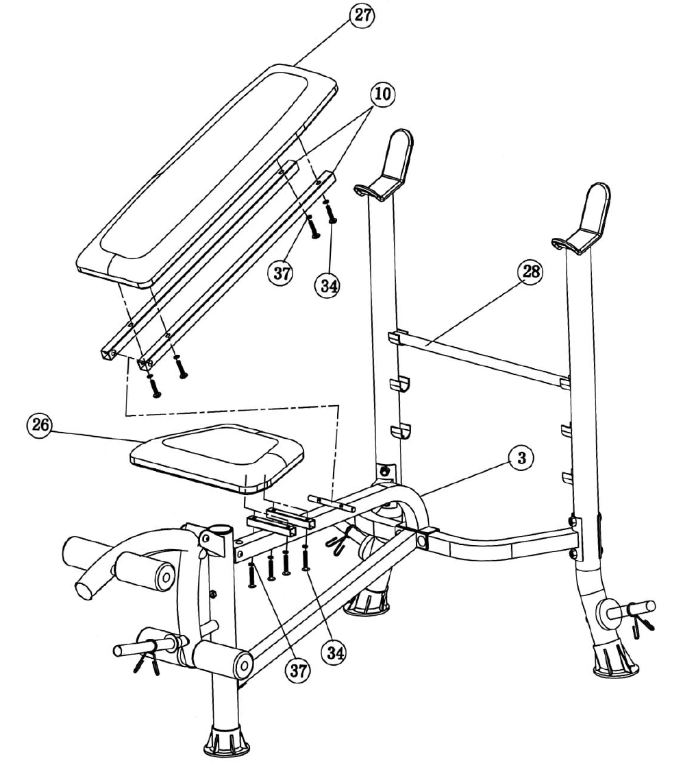 - C.) Place the Seat Pad (#26) onto the Main Seat Support. Secure it with four M6 x 1 ½” Hex Bolts (#34) and Ø ½” Washers (#37).