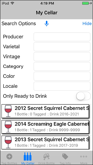 the setup step, your list of wine bottles should show up in the "My Cellar" screen in the