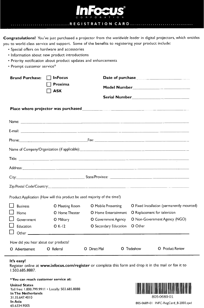 InFocus Customer Service – 1-800-799-9911 or techsupport@infocus.com