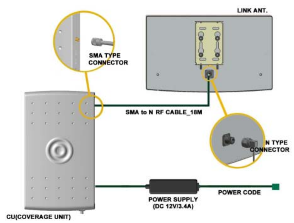 connects the LINK ANT to the CU. The power cable is also connected to the CU.