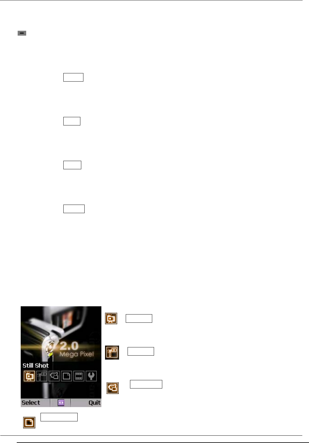 (STILL SHOT, SELF SHOT, CAMCORDER, PHOTO ALBUM, CAMCORDER ALBUM, CAMERA SETTING)