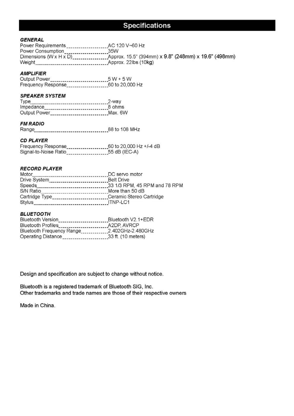 INNOVATIVE TECHNOLOGY ELECTRONICS LLC Music Center with Bluetooth