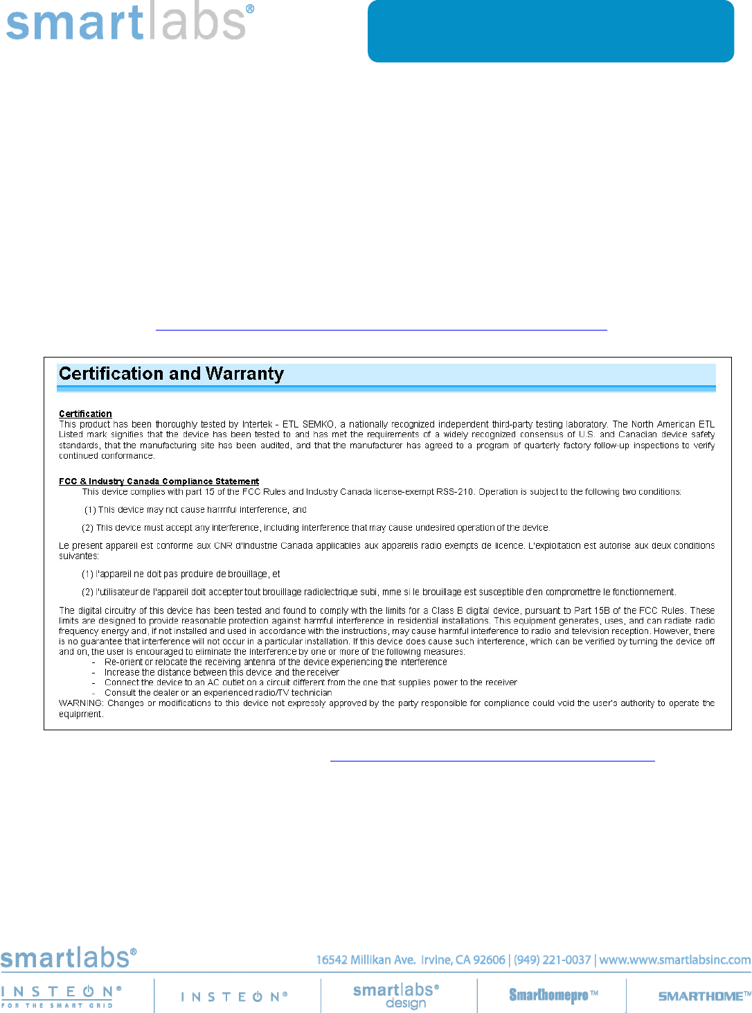 extent of Seller’s liability with respect to this product. For repair or replacement during the warranty period, call INSTEON support at 800-762-7845 with the Model #