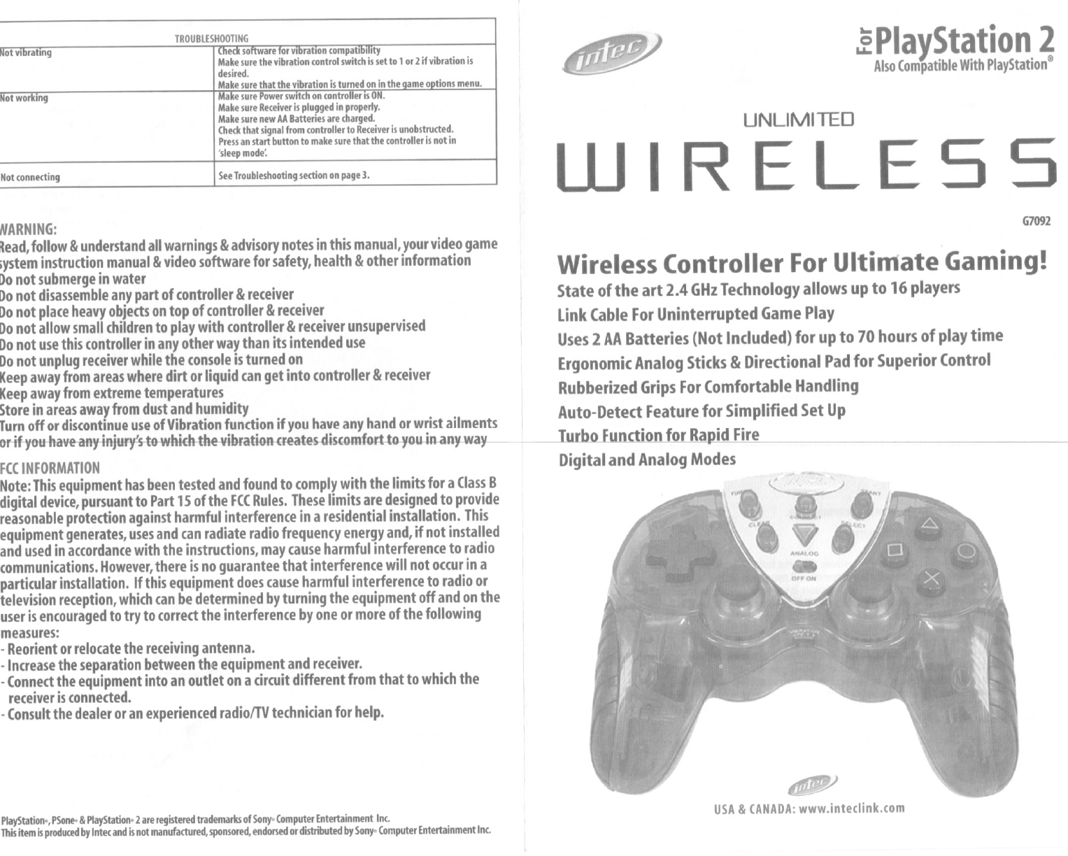 Intec Inc. PS2 WIRELESS CONTROLLER : GAME PAD Caution