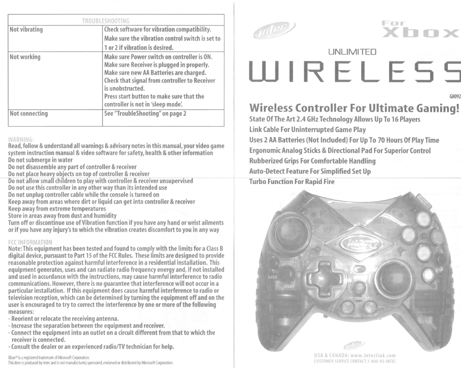 Intec Inc. XBOX WIRELESS CONTROLLER-HOST Caution