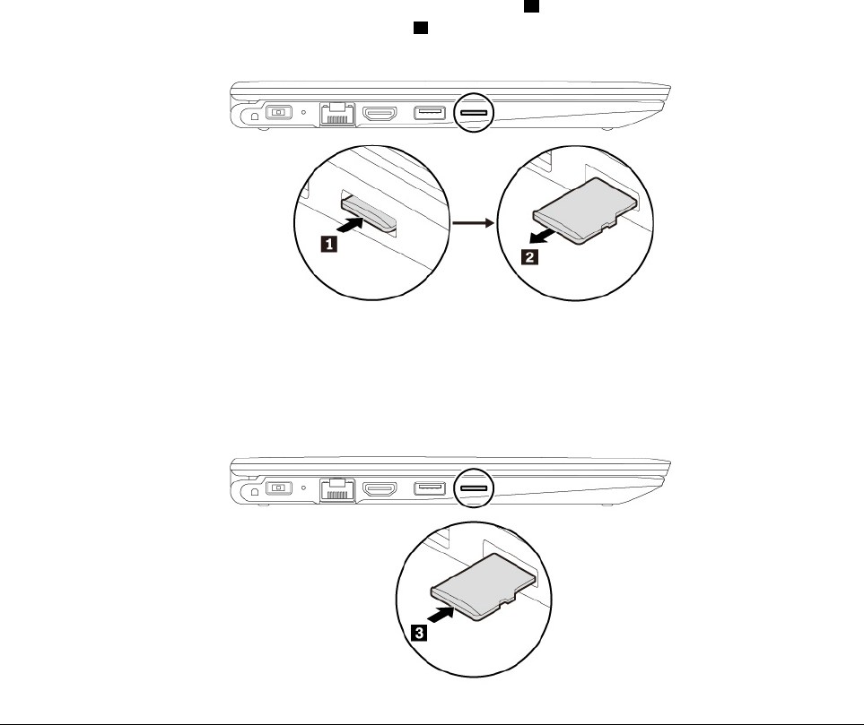 2. Push the microSD card inward a little bit until you hear a click 1. Then, release it. The microSD card