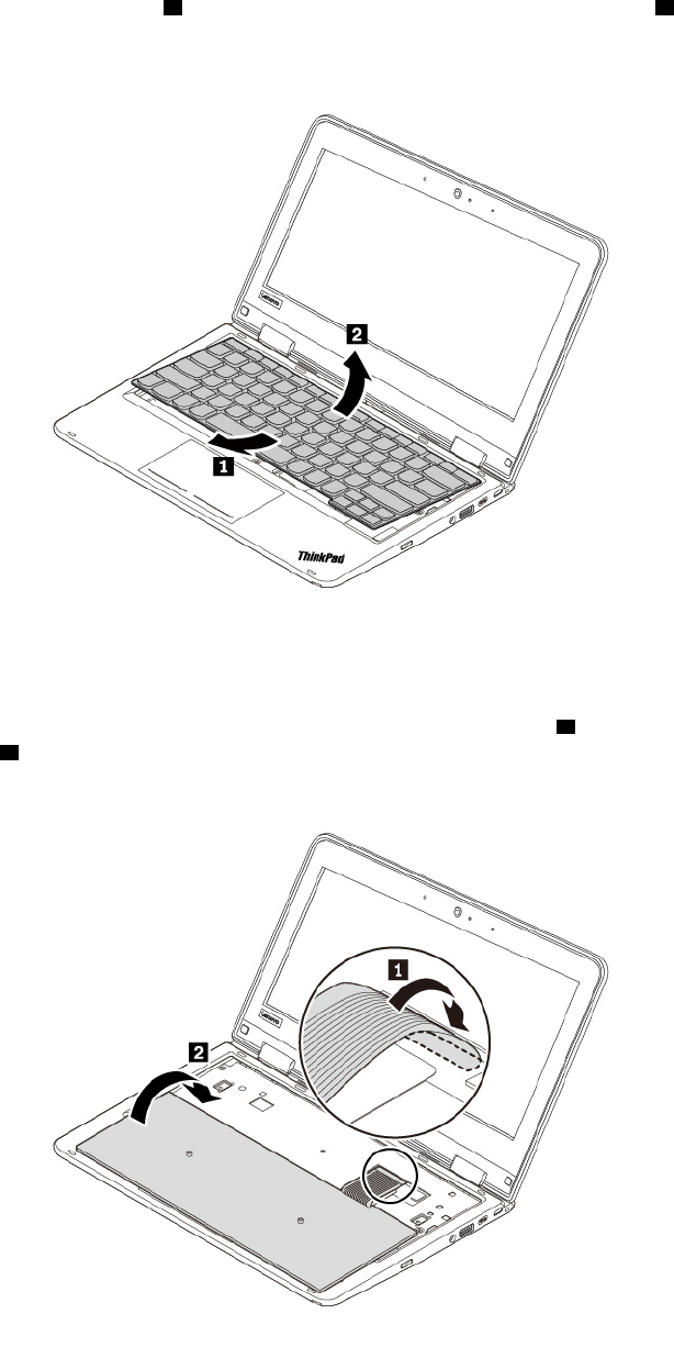 7. Lift the keyboard slightly as shown 1. Pivot the keyboard slightly upward to remove it 2 from the