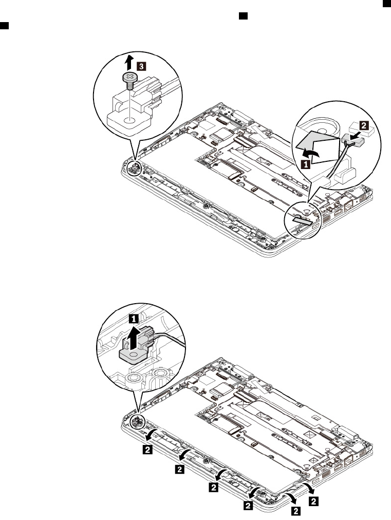 5. Detach the connector of the speaker assembly 1 from the system board. Remove the screws 2.