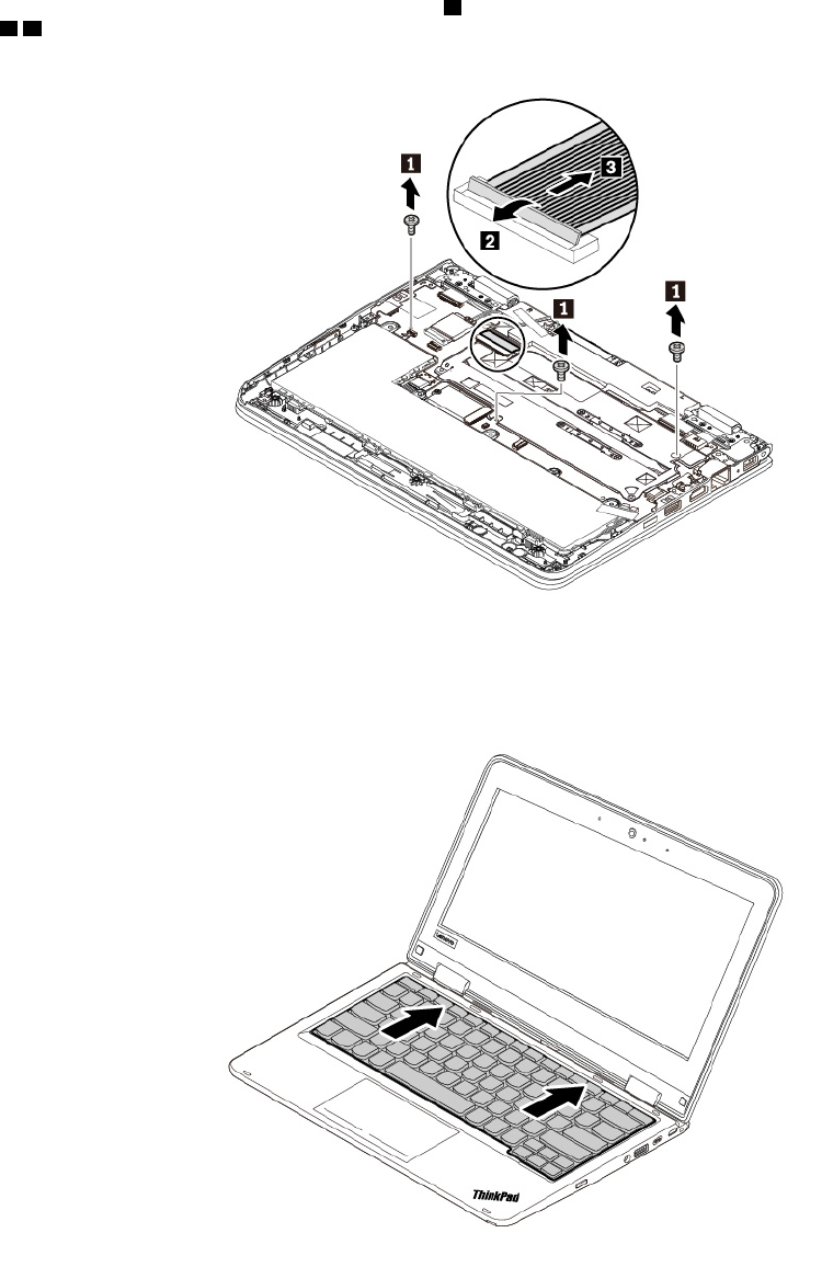 7. Lift the keyboard slightly as shown 1. Pivot the keyboard slightly upward to remove it 2 from the