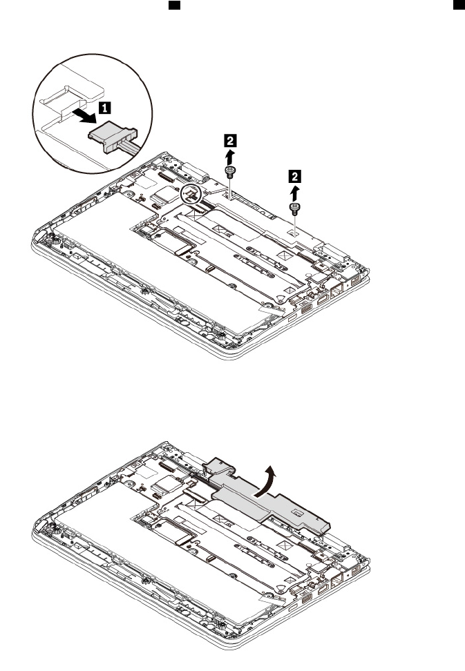 5. Detach the connector of the speaker assembly 1 from the system board. Remove the screws 2.