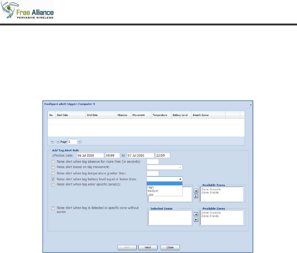 Raise alert when tag battery level equal or below than user specified battery level ..... 23