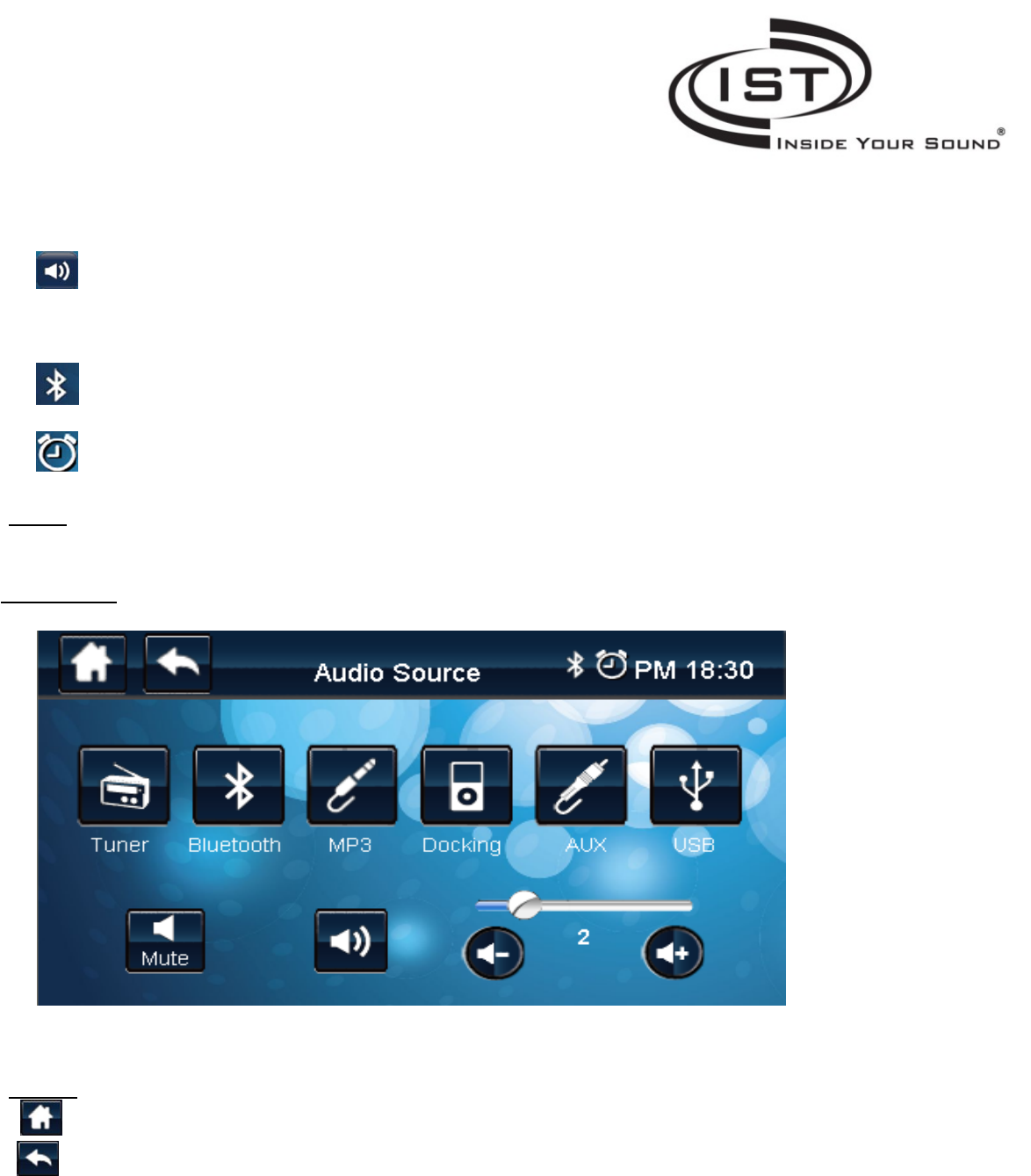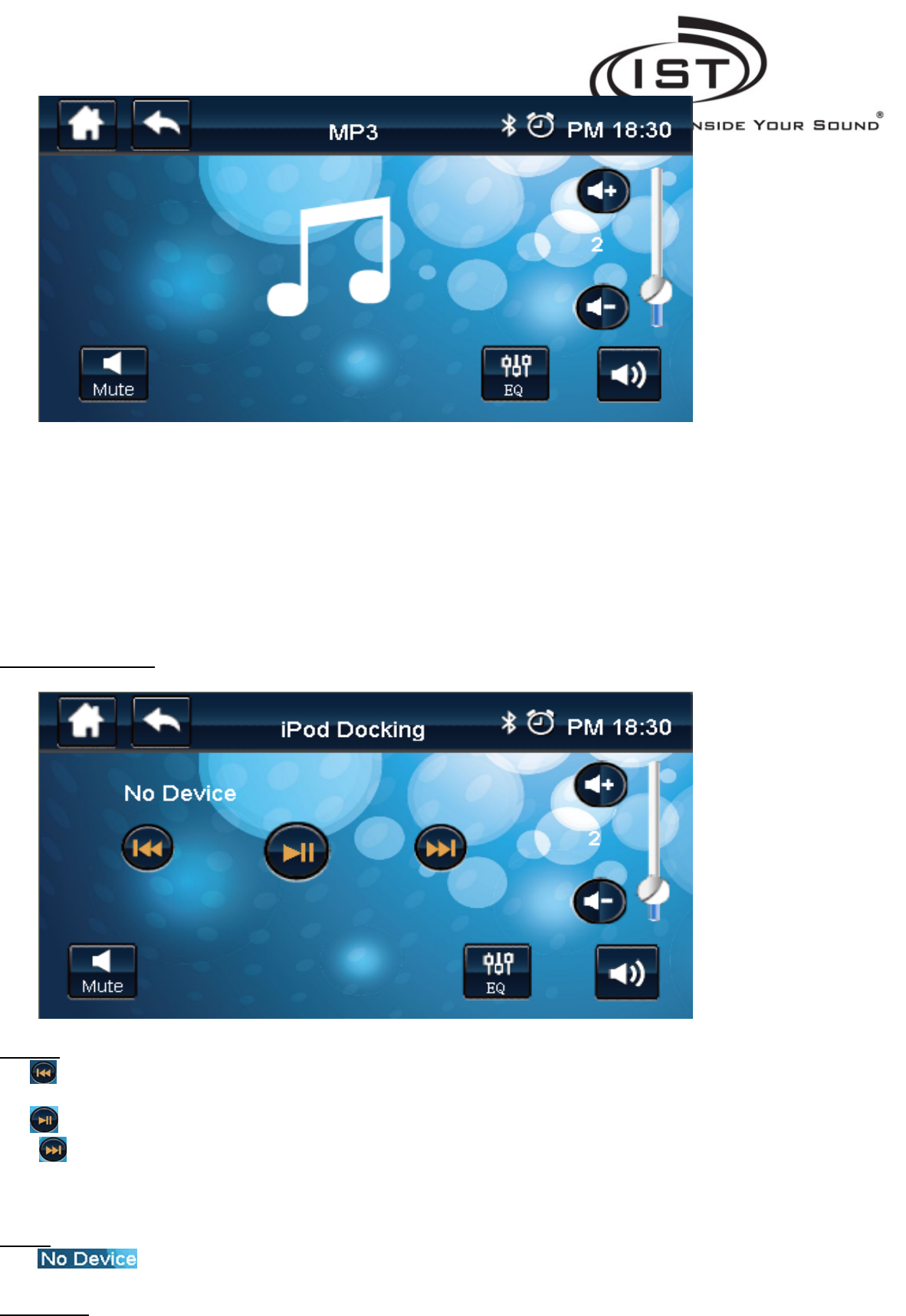 EQ: Enter the iPod Docking Graphic Equalizer to adjust treble and bass frequencies