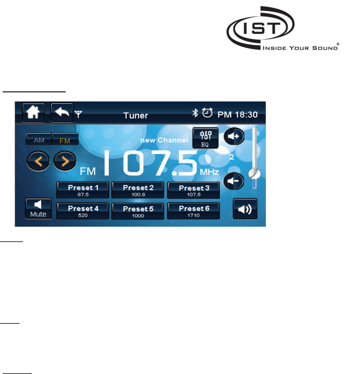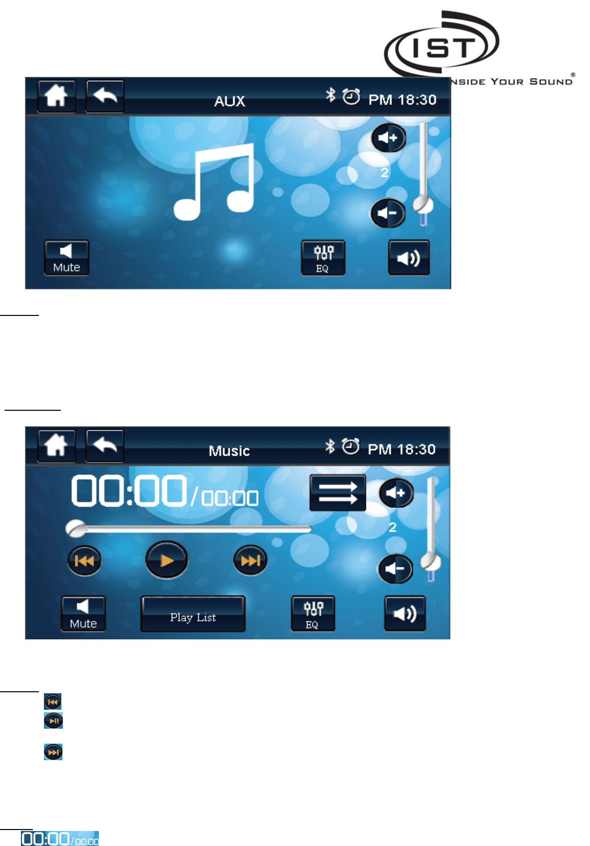 EQ: Enter the AUX Graphic Equalizer to adjust treble and bass frequencies