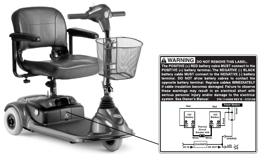 - Do not connect any medical devices such as ventilators, life support machines, etc., to the battery. This could cause unexpected failure of the device and the powered scooter.