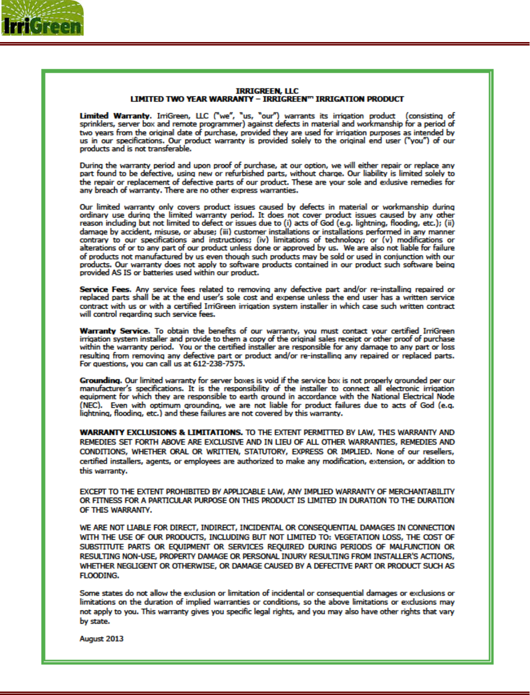 modifications to the system not expressly approved by IrriGreen. Unauthorized modifications will void