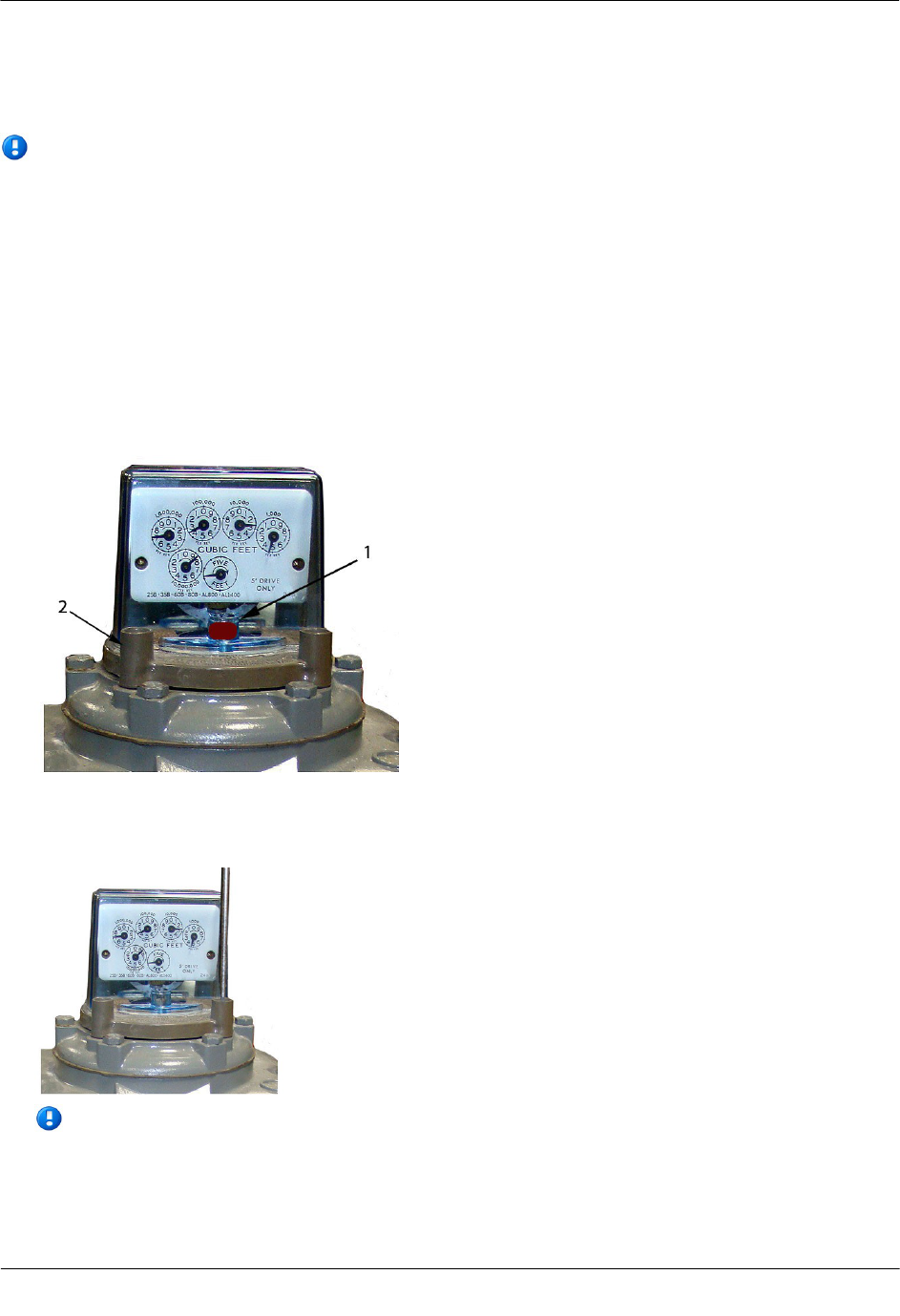 1. Align the white wriggler (1) so one of its four drive slots lines up with the meter's drive dog (2).
