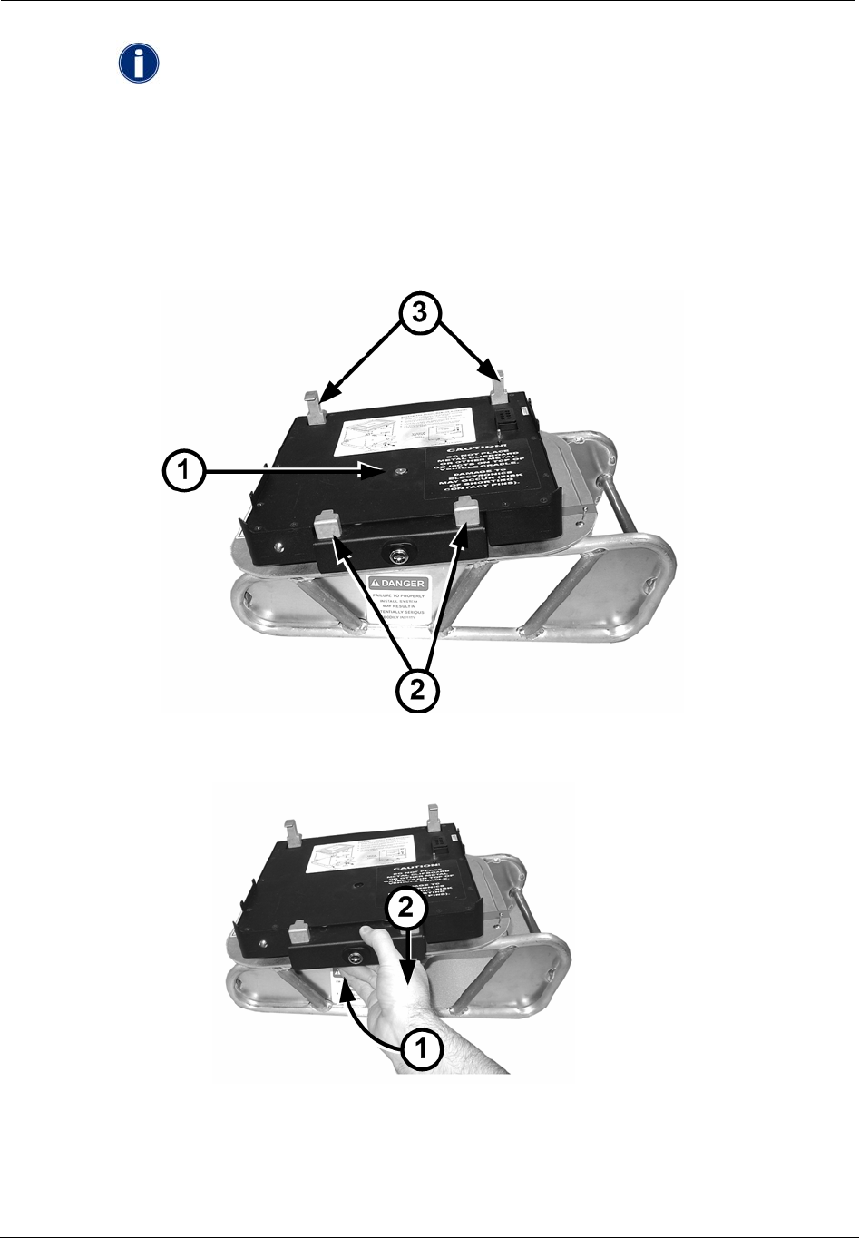 When unlocked, this pin is not visible. The front (2) and rear (3) mounting guides are