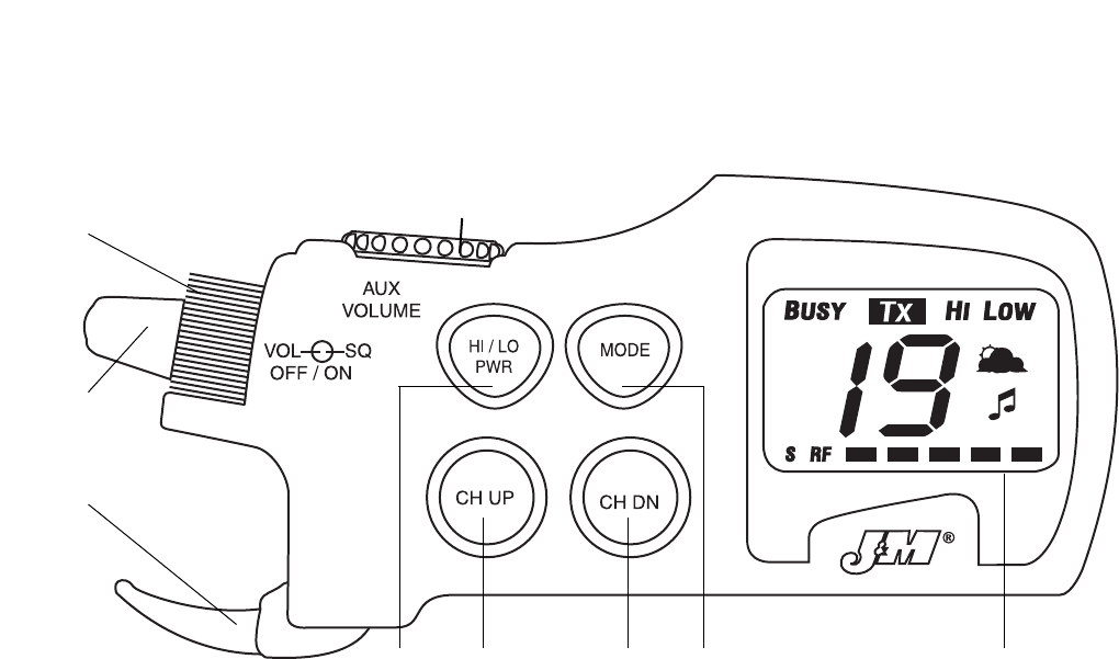 I. LCD Display—Identifies CB or weather channe, Tx (transmit), Wx (weather mode), and