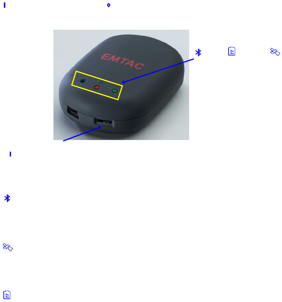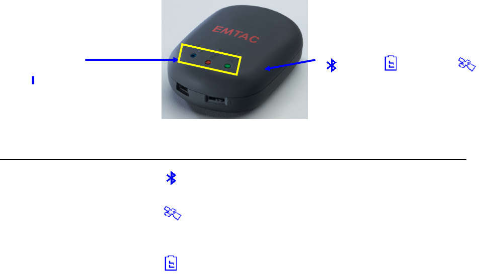 The three LED lights indicate the operational status of Bluetooth, GPS, and battery.