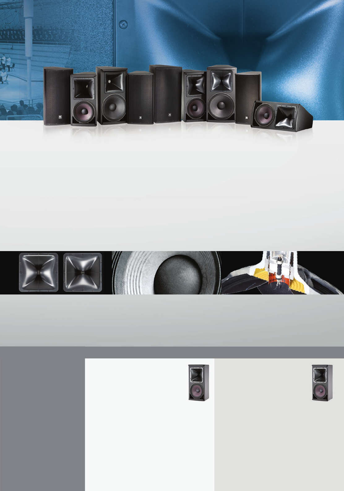 AE Series three-way and mid-high models utilize the latest in transducer technology. All low-frequency drivers are JBL’s patented