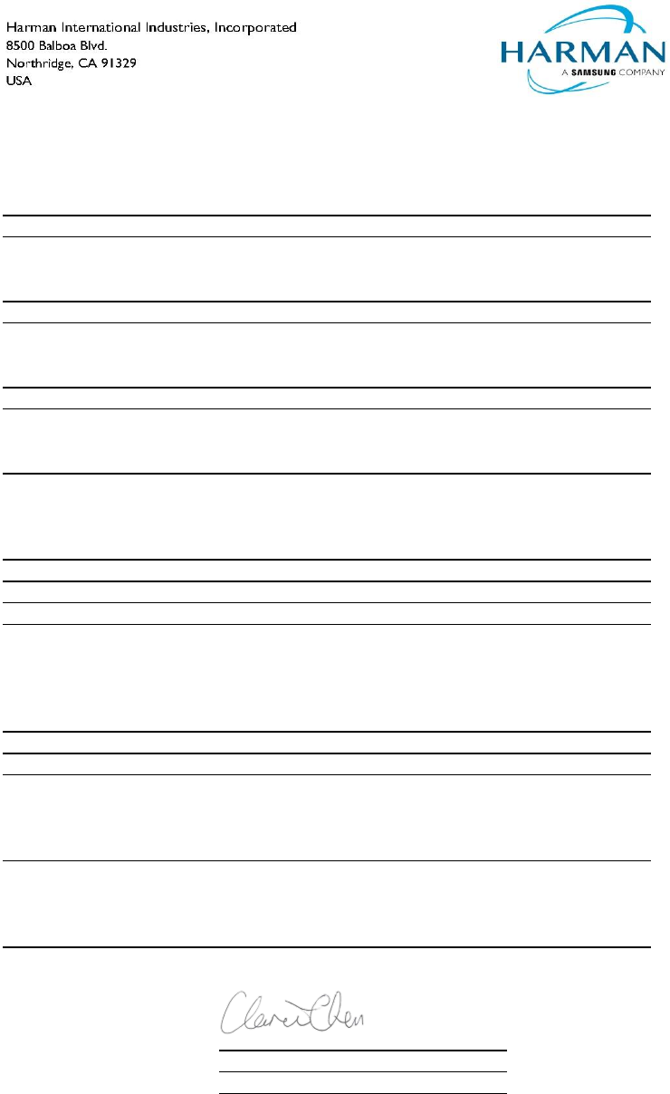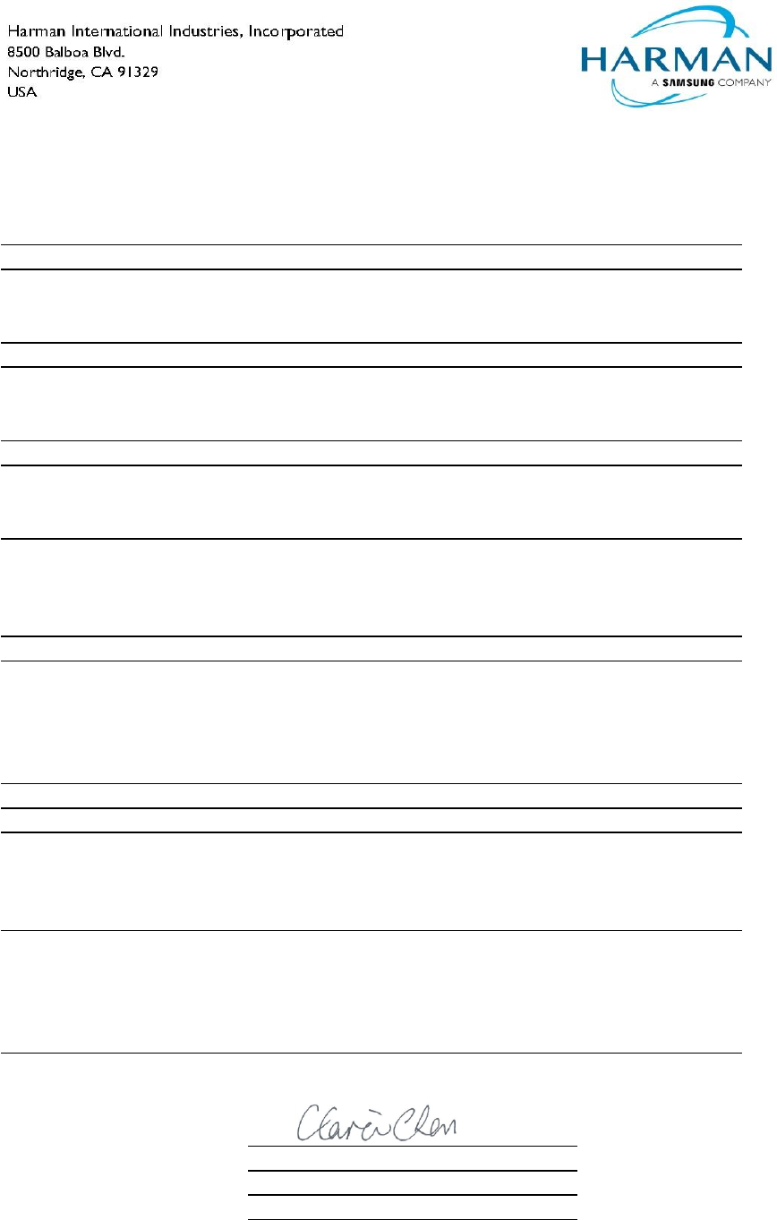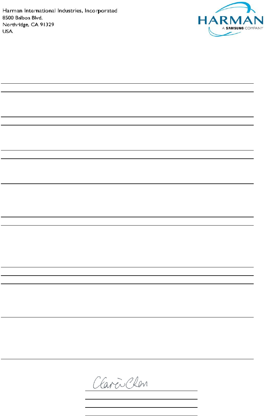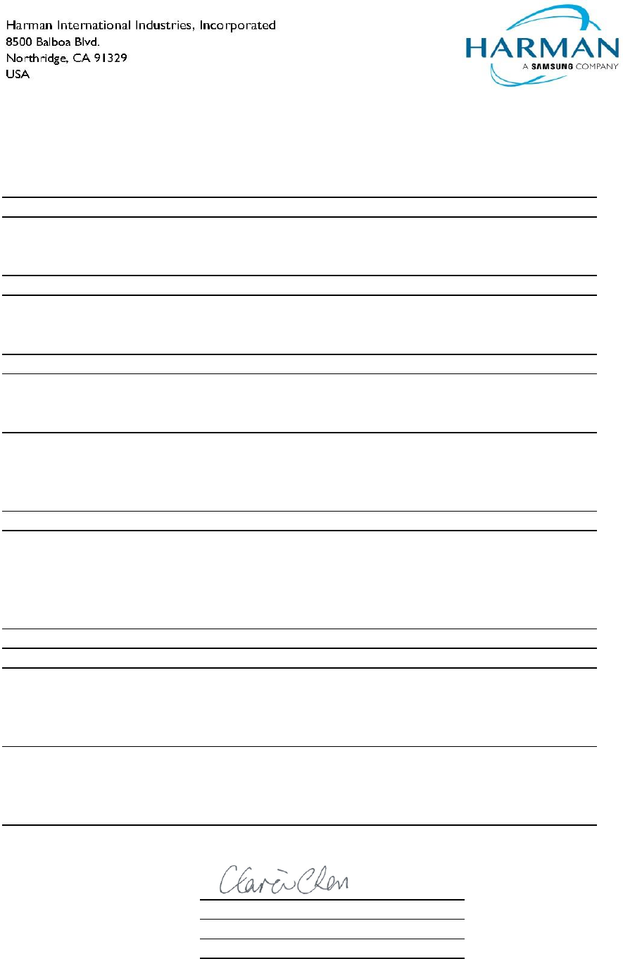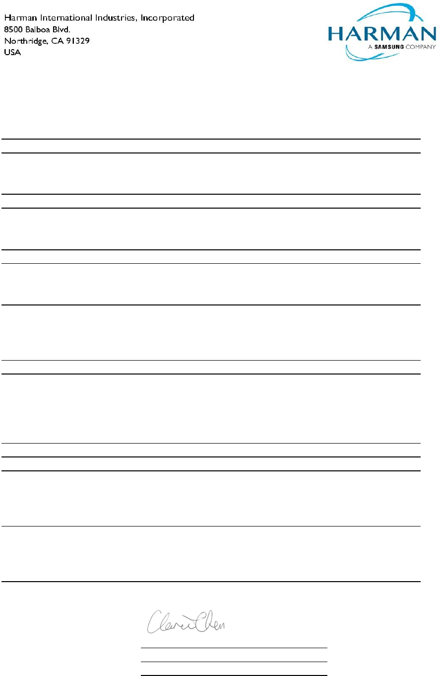 Signed for and on behalf of: Harman International Industries, Incorporated