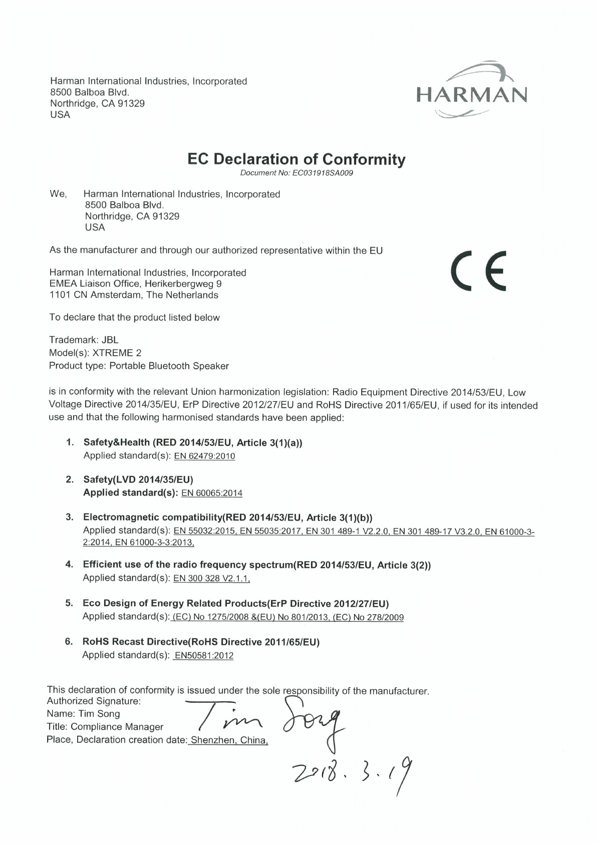 JBL XTREME 2 - Declaration of Conformity JBL Xtreme 2 | Portable Bluetooth Speaker