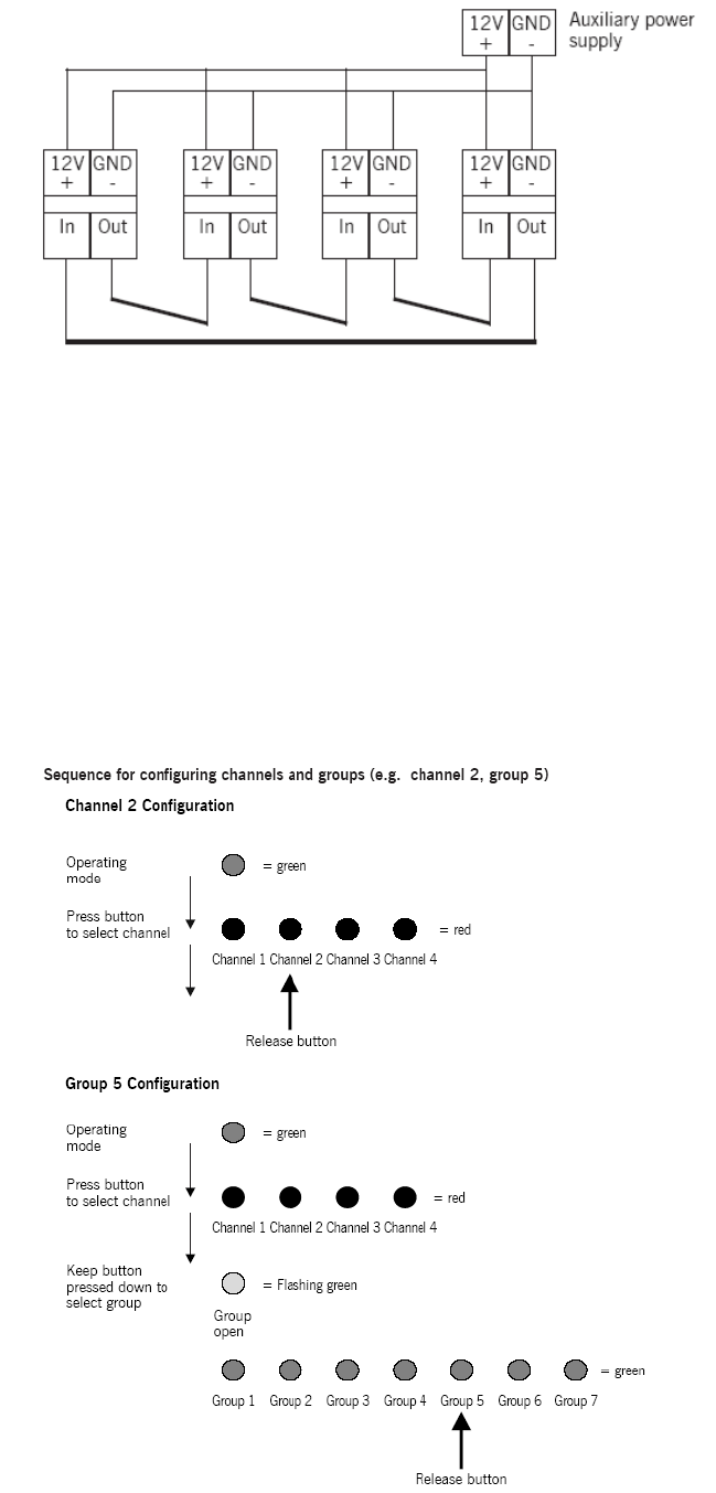 Group configuration: Press the configuration button and keep it pressed down. The led will issue the red channel