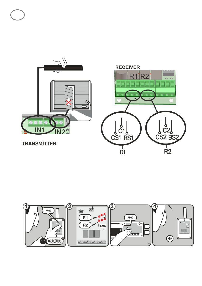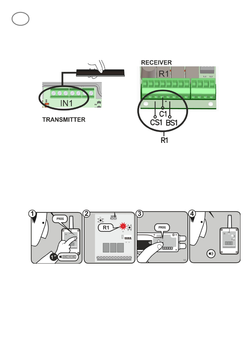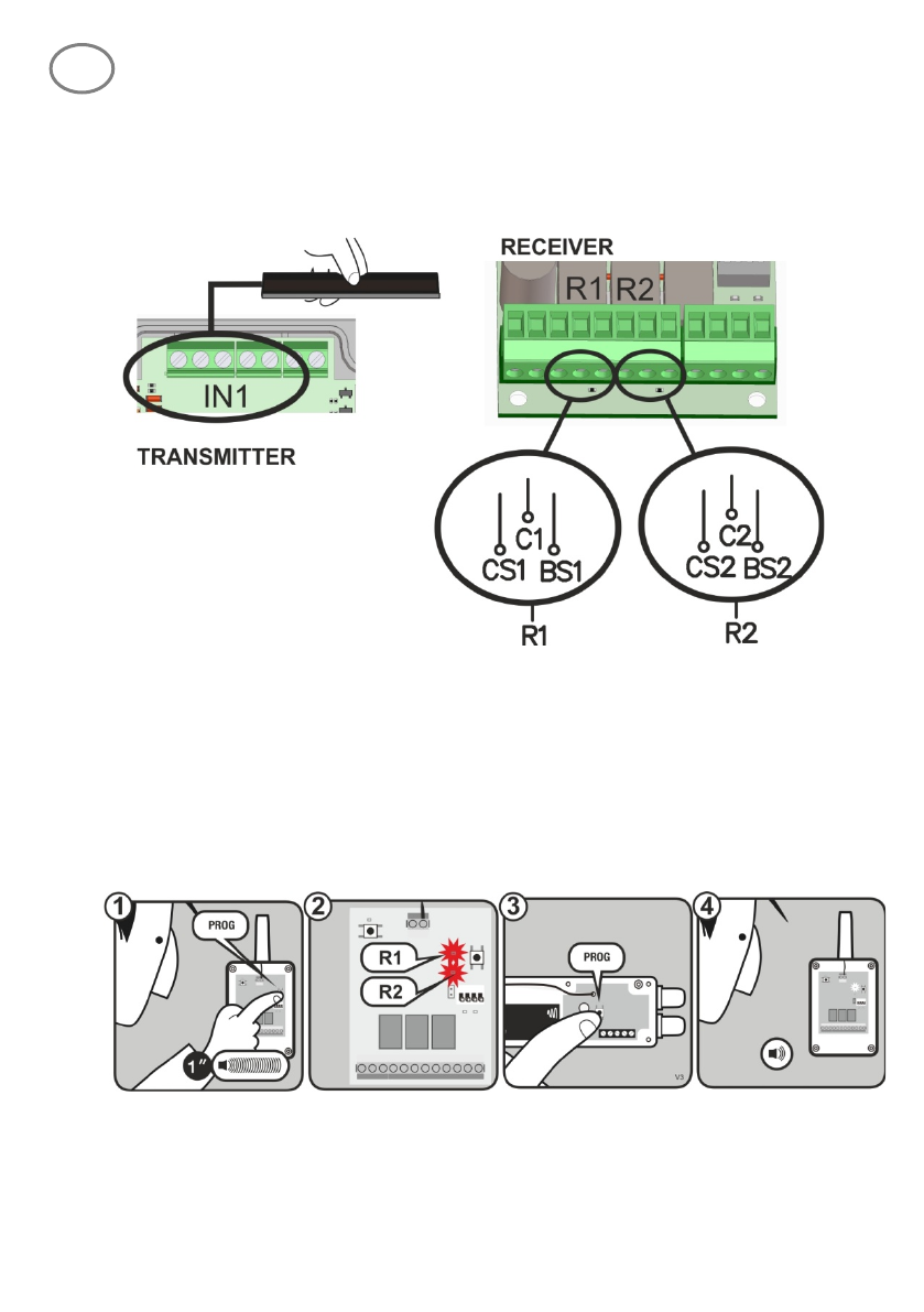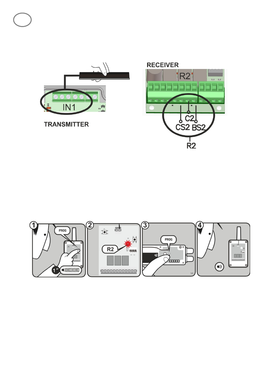 • Press PROG button on the receiver (1) until the R1 LED lights on (2).