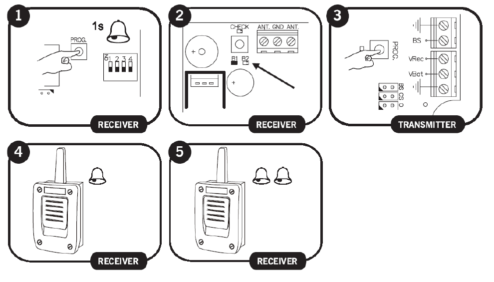 1. Press the receiver PROG and CHECK buttons simultaneously until the three CHECK, B1 and B2 leds go light on.